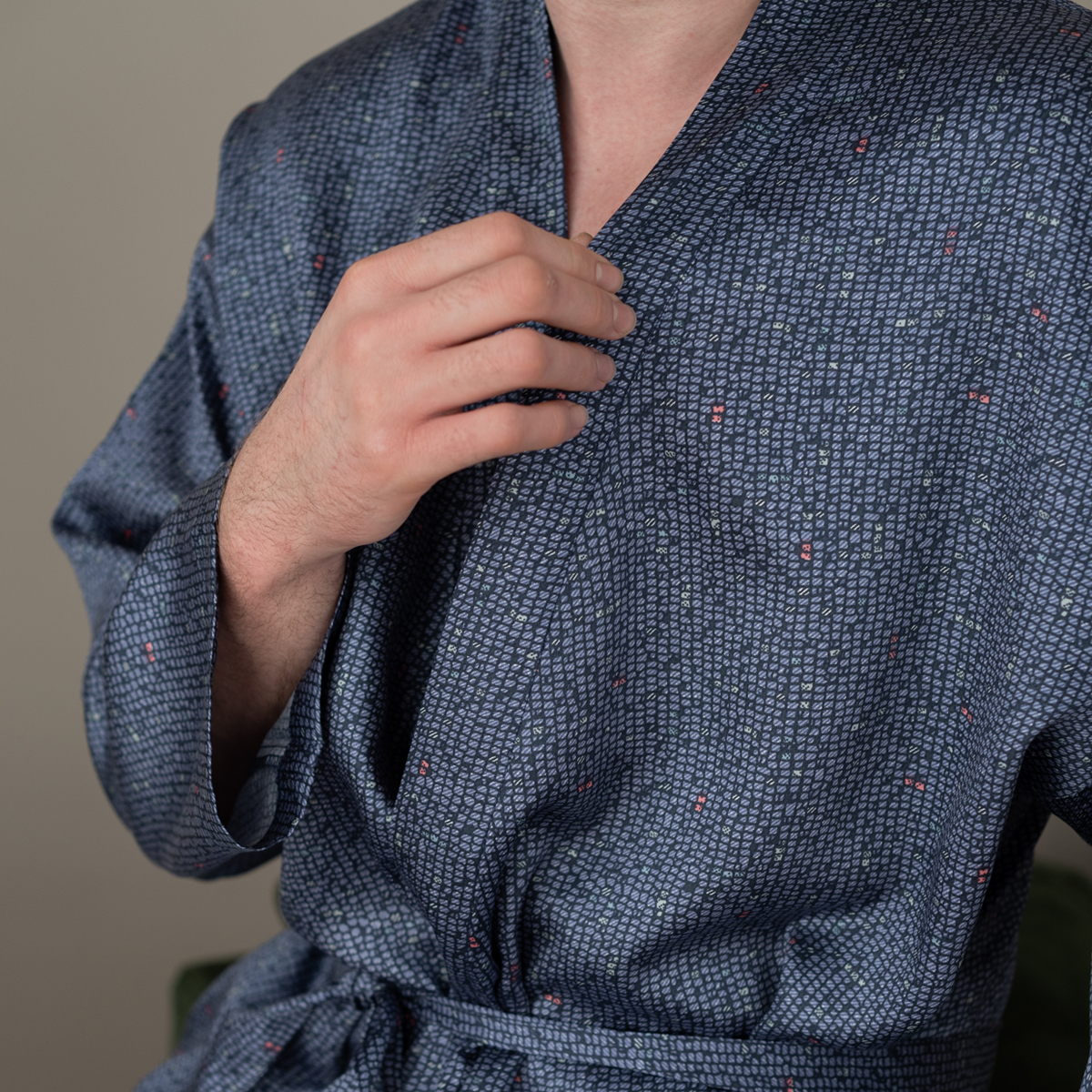 Модель: халат-кимоно, завязывается поясом на запах, имеет внутренние завязки и карманы в швах
