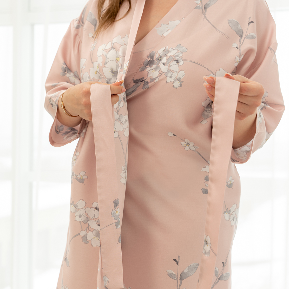 Модель: халат-кимоно, завязывается поясом на запах, имеет внутренние завязки и карманы в швах