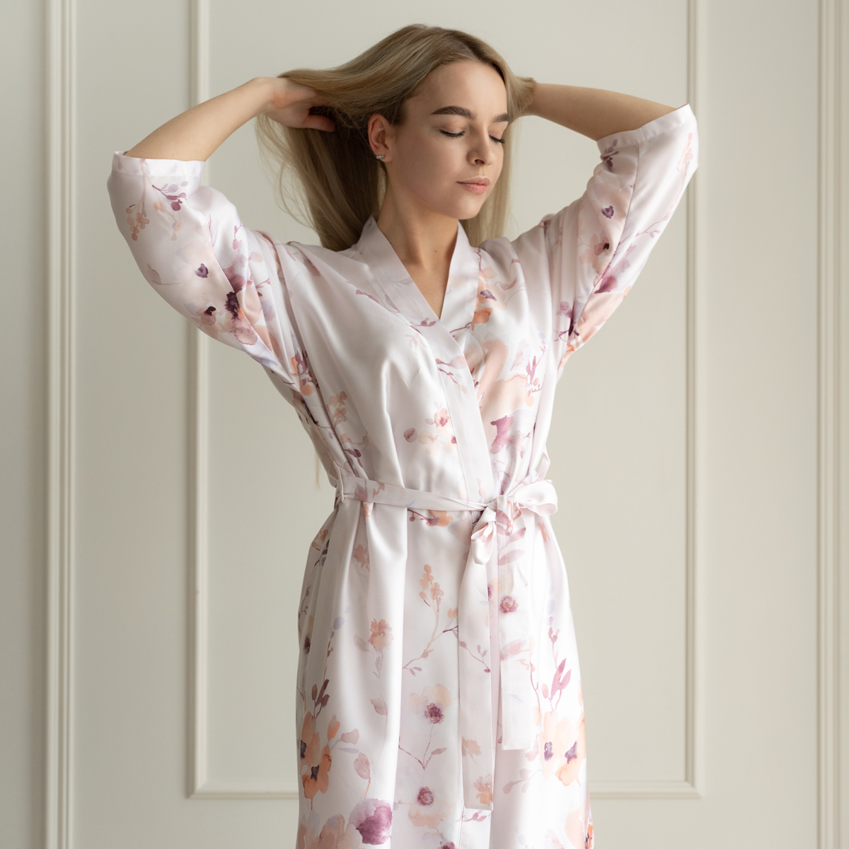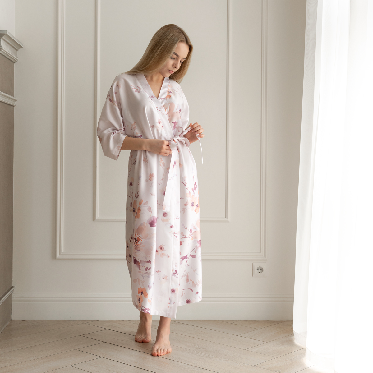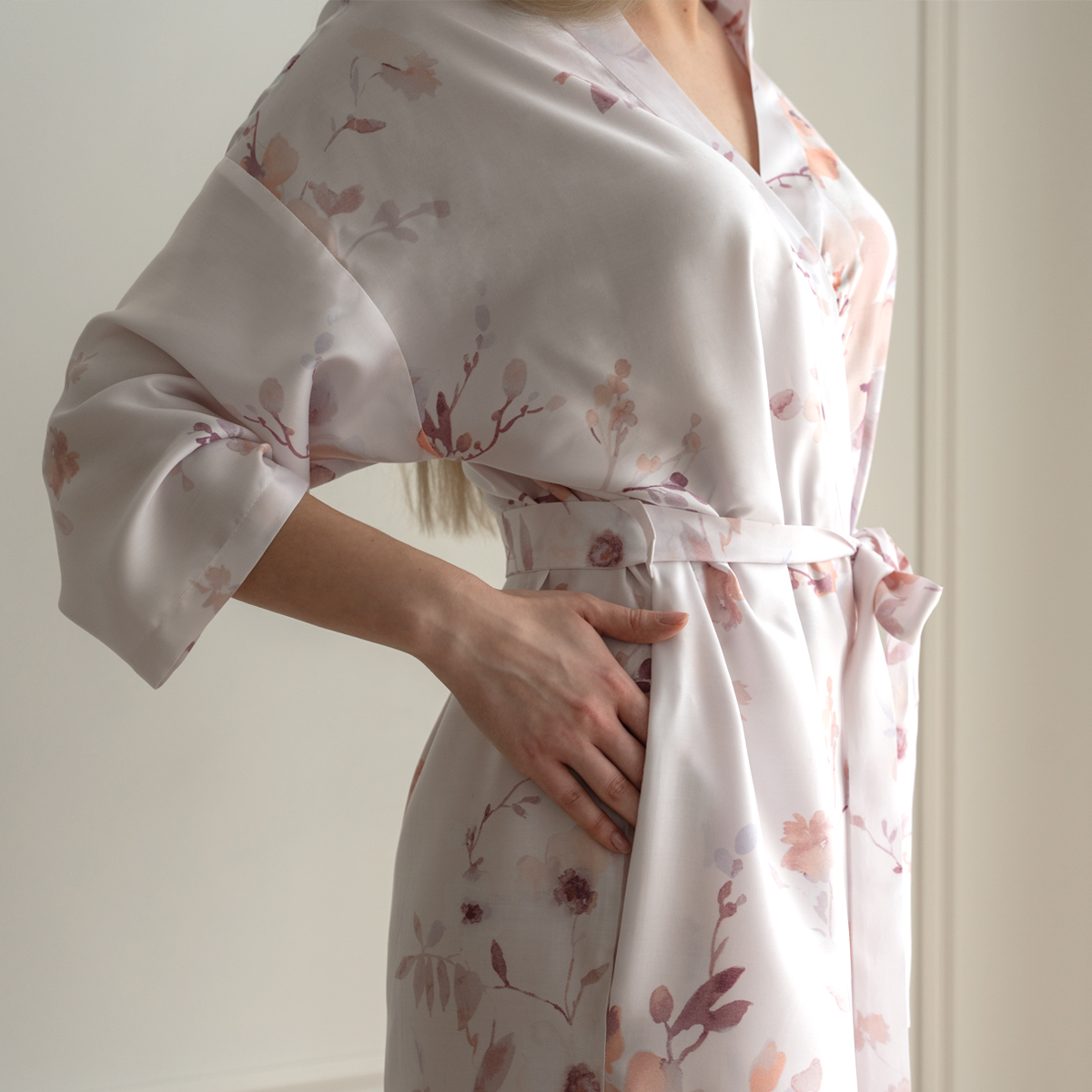 Модель: халат-кимоно, завязывается поясом на запах, имеет внутренние завязки и карманы в швах