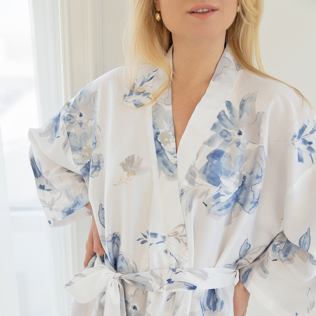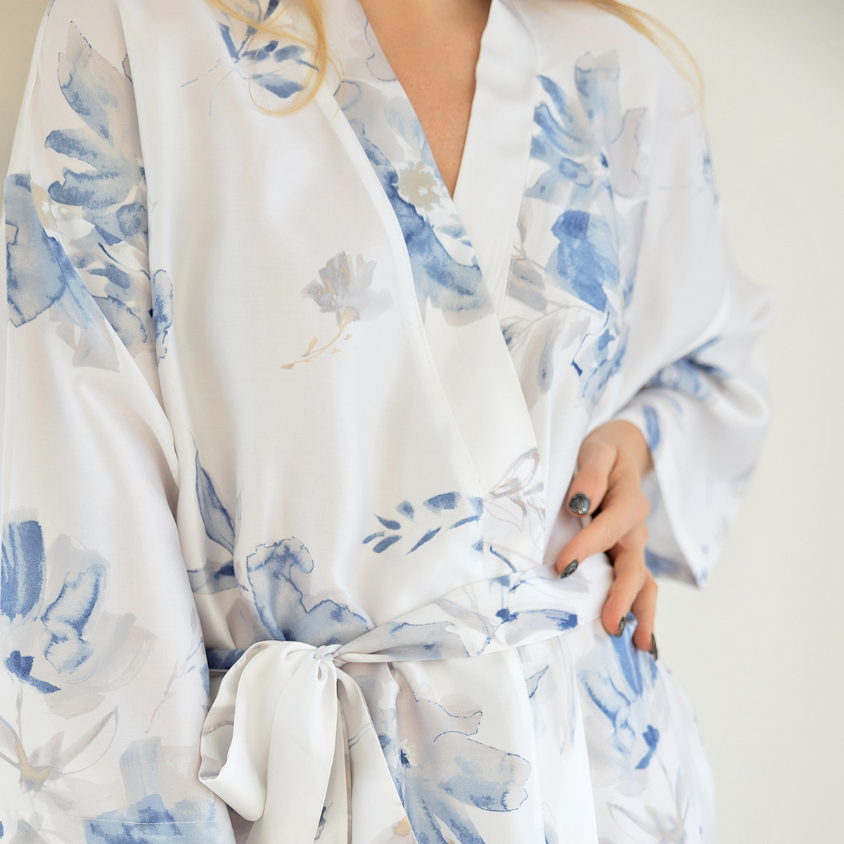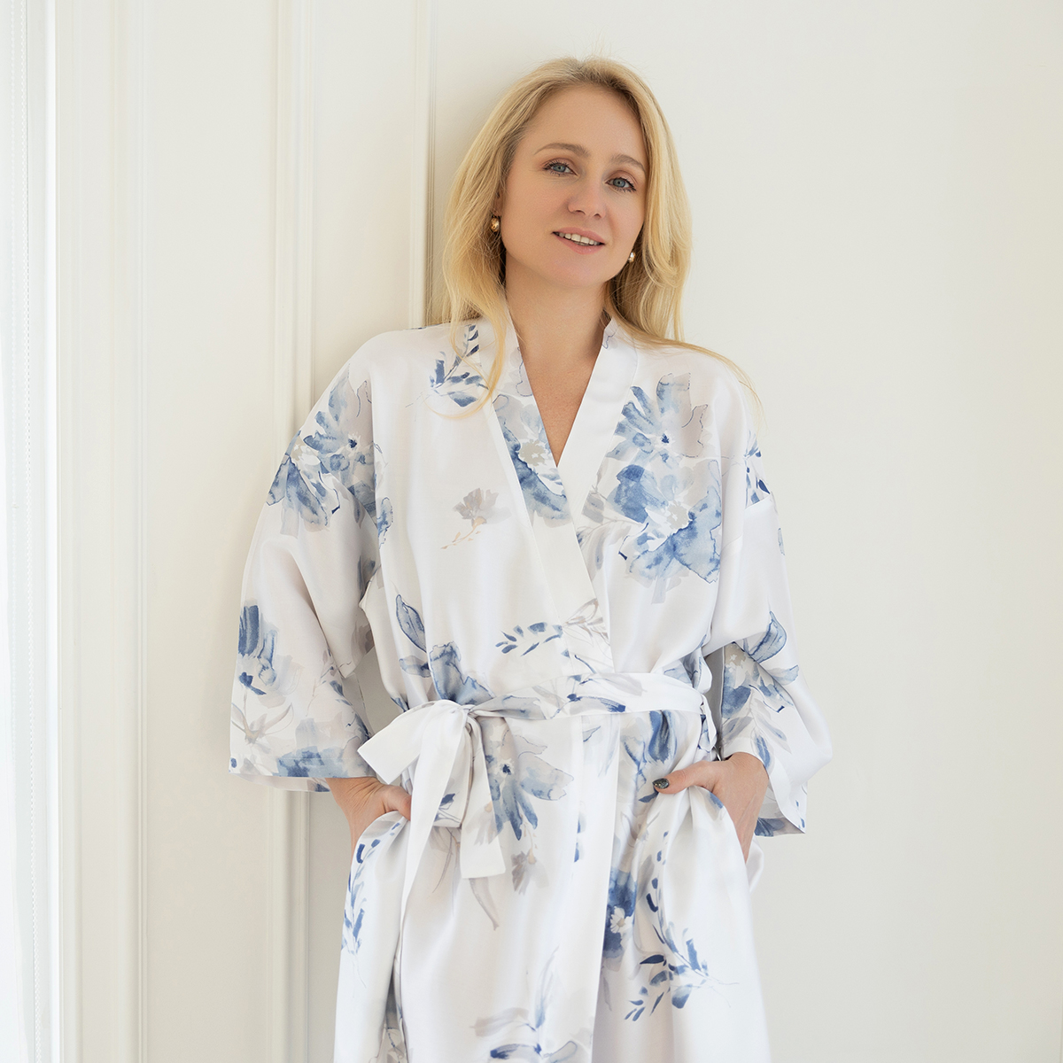 Модель: халат-кимоно, завязывается поясом на запах, имеет внутренние завязки и карманы в швах