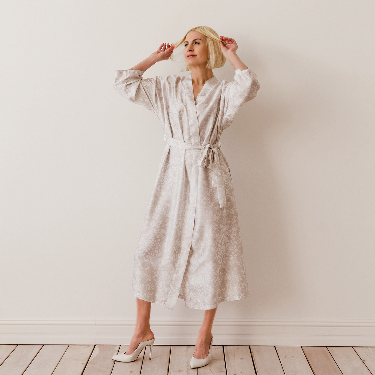 Модель: халат-кимоно, завязывается поясом на запах, имеет внутренние завязки и карманы в швах