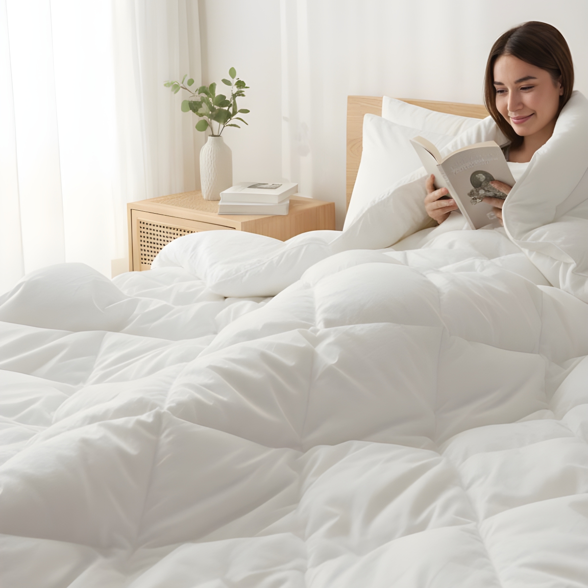 Благодаря объемному наполнителю одеяло обволакивает приятной тяжестью, создавая эффект антистресс-объятий, тем самым помогая полноценно расслабиться и быстрее заснуть.