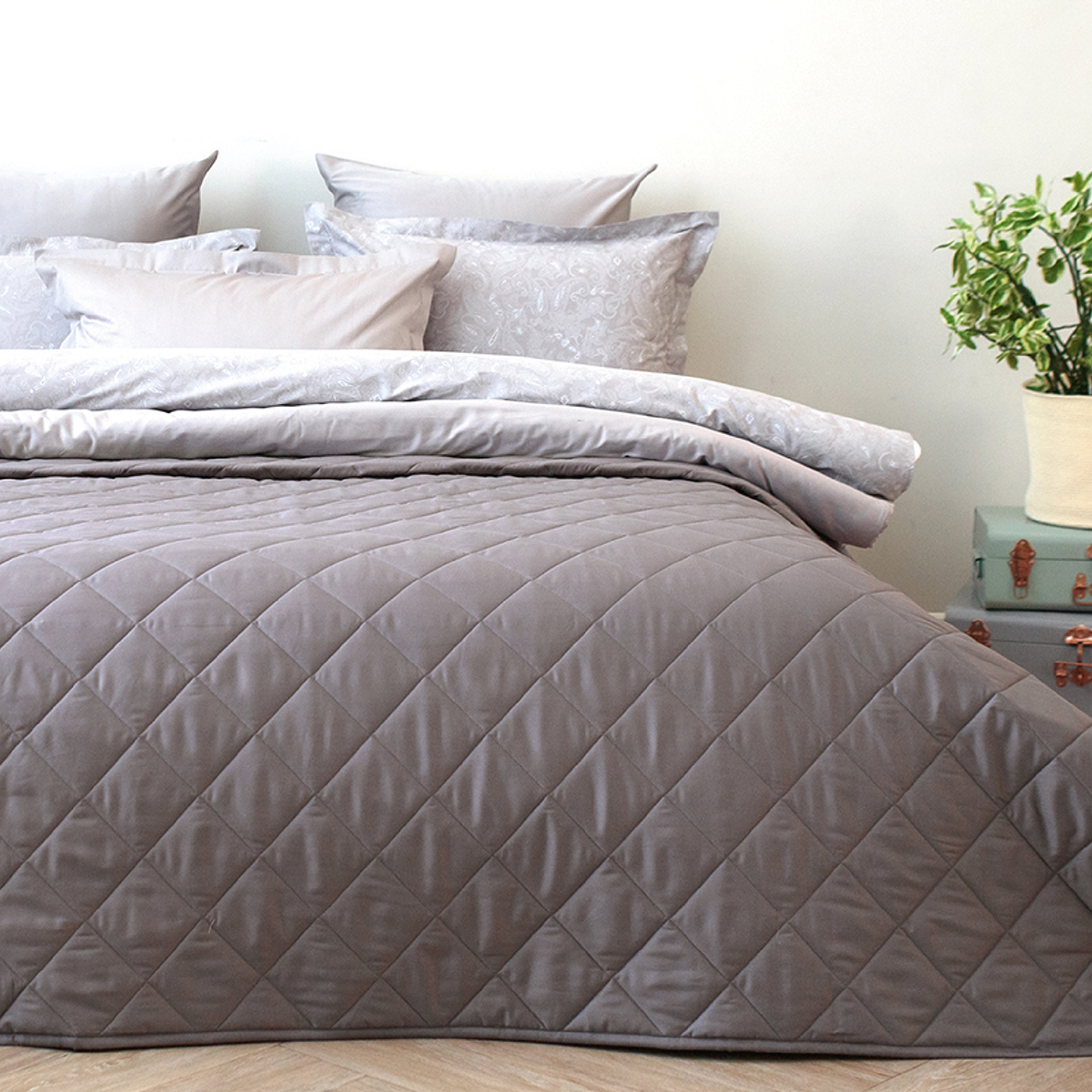 Удобное решение для оформления интерьера в едином стиле - покрывала выполнены в тех же расцветках и из той же ткани, что и однотонное постельное белье La Prima.