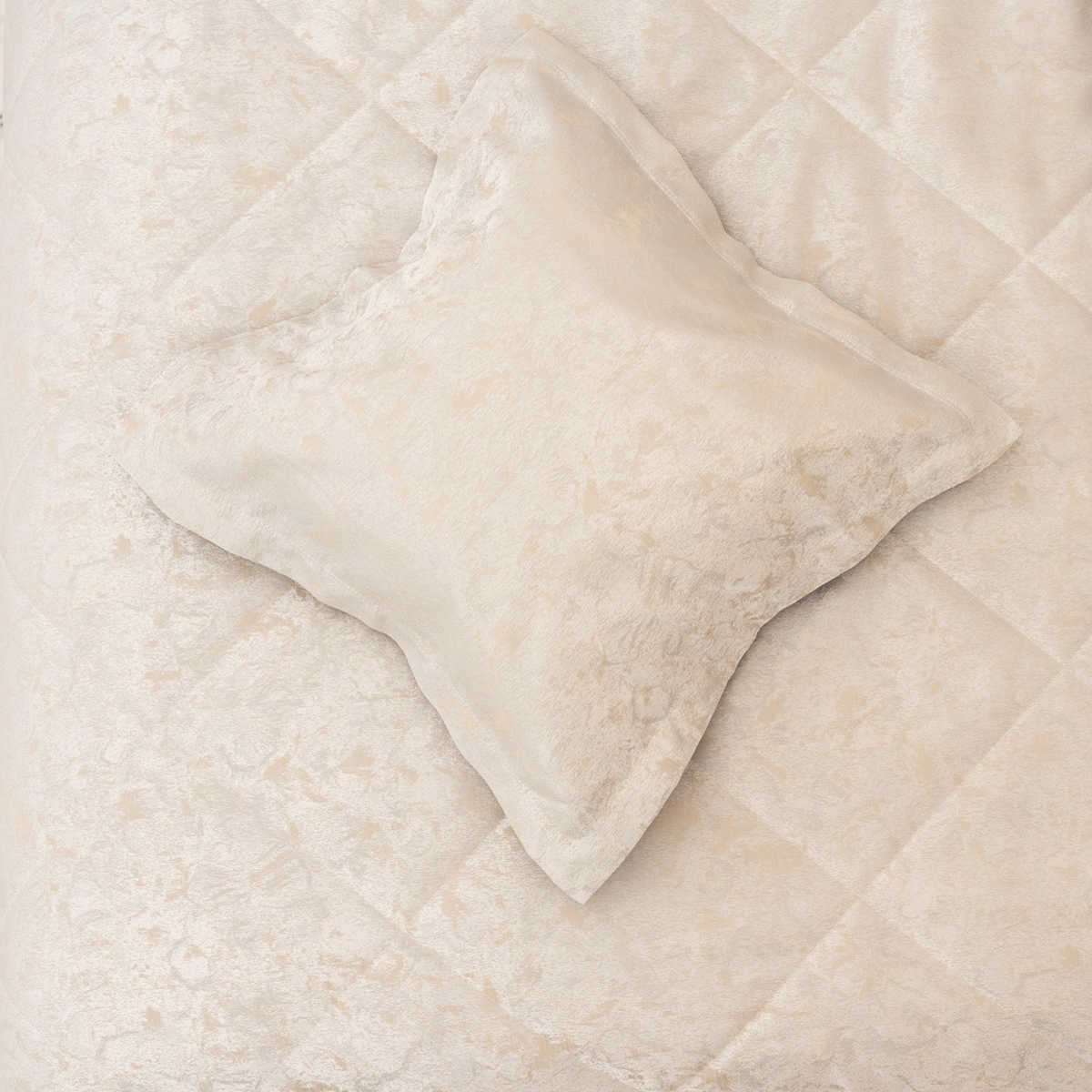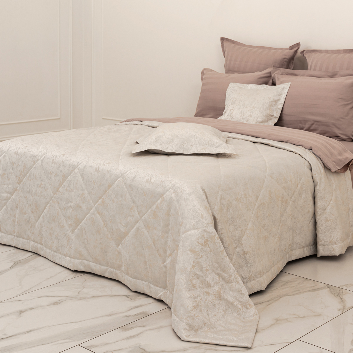Состав: ткань портьерная жаккард 100% пэ, наполнитель - полиэфирное волокно. Стежка в виде ромбов. Подклад покрывала – микрофибра велюр, за счет своей фактуры он предотвращает скольжение покрывала на кровати.