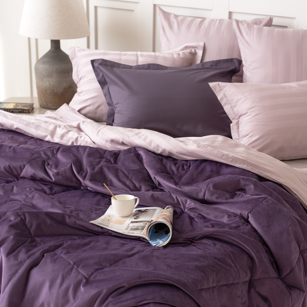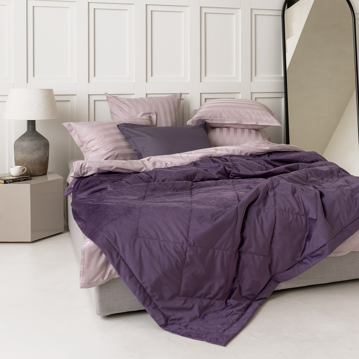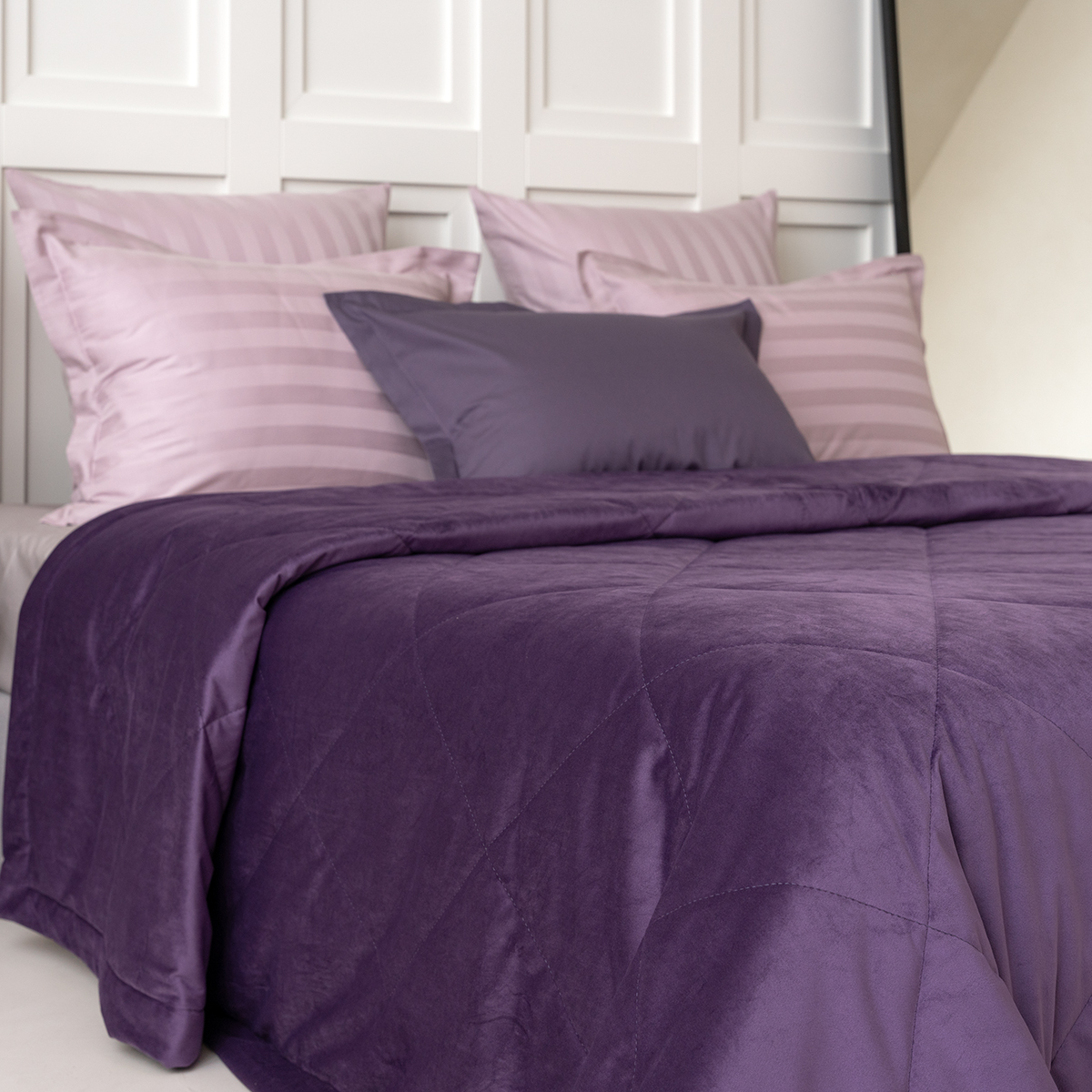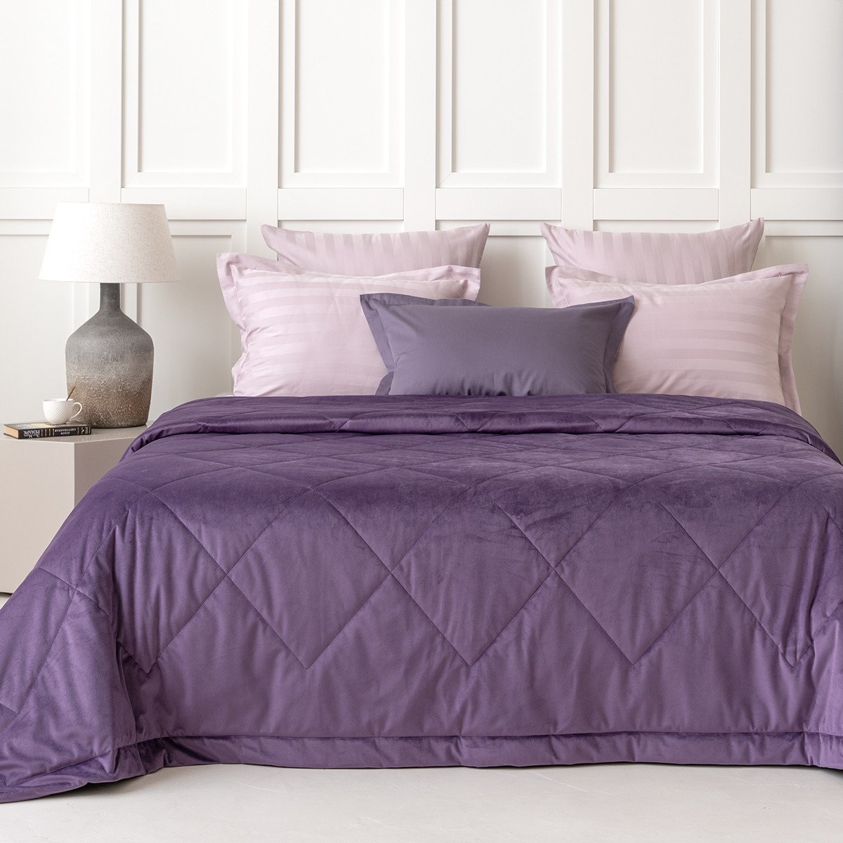 Состав: бархат 100% пэ, наполнитель - полиэфирное волокно. Подклад покрывала – микрофибра велюр, за счет своей фактуры он предотвращает скольжение покрывала на кровати. Стежка в виде ромбов.