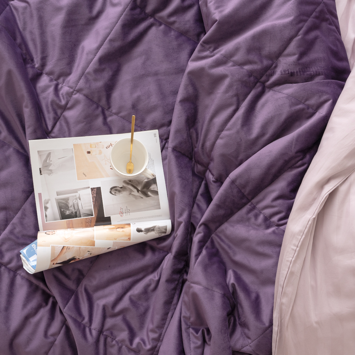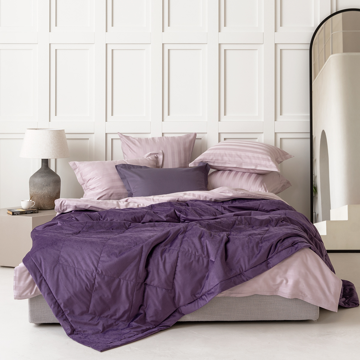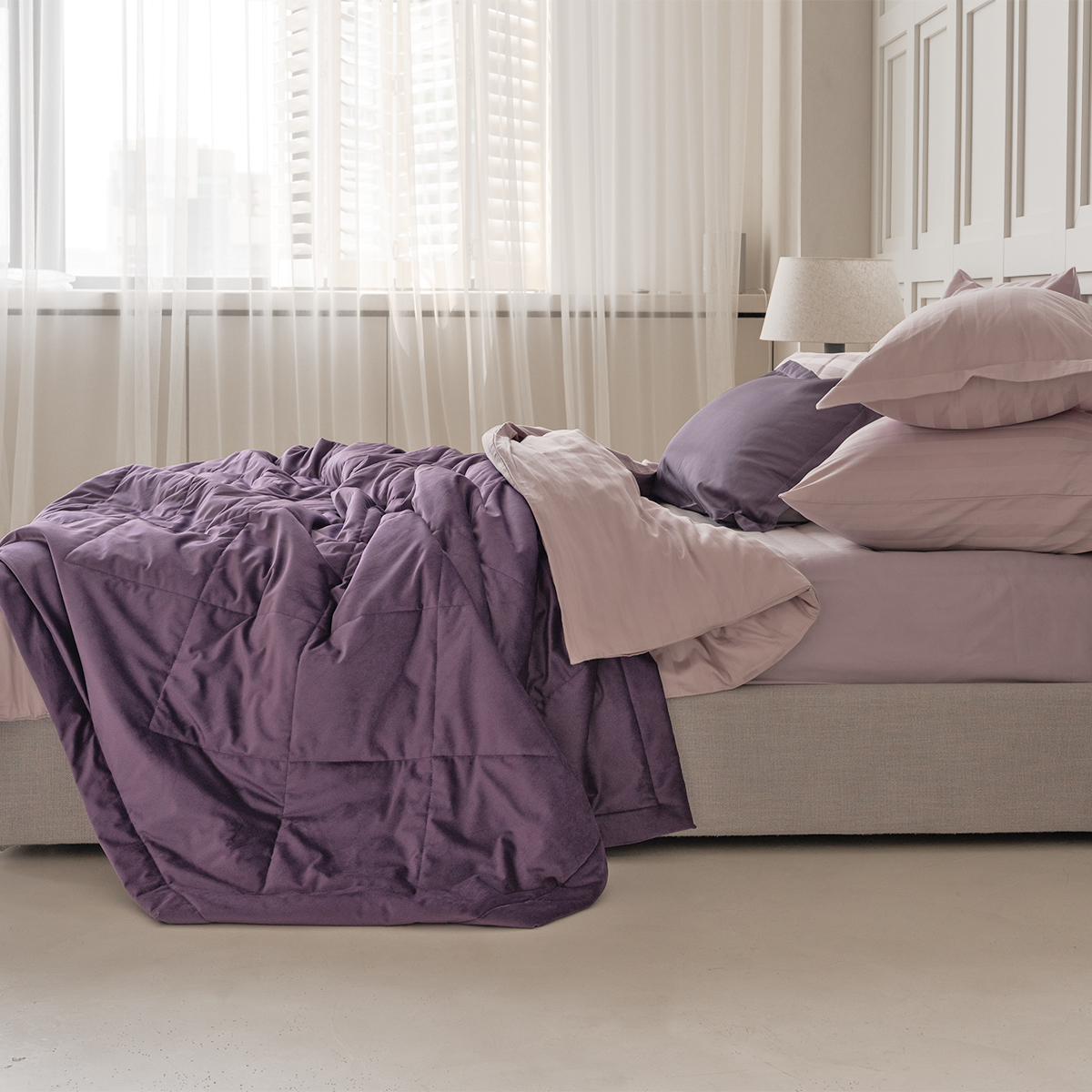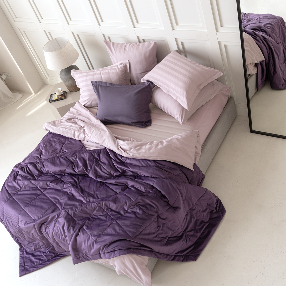 Состав: бархат 100% пэ, наполнитель - полиэфирное волокно. Подклад покрывала – микрофибра велюр, за счет своей фактуры он предотвращает скольжение покрывала на кровати. Стежка в виде ромбов.