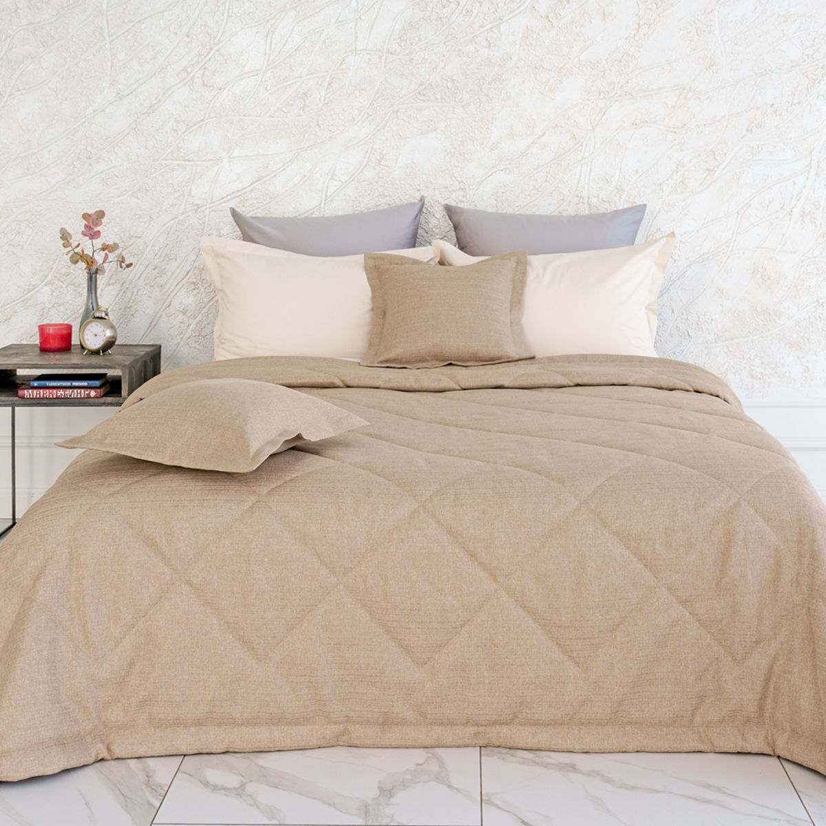 Состав: ткань портьерная 100% пэ, наполнитель - полиэфирное волокно. Стежка в виде ромбов. Подклад покрывала – микрофибра велюр, за счет своей фактуры он предотвращает скольжение покрывала на кровати.