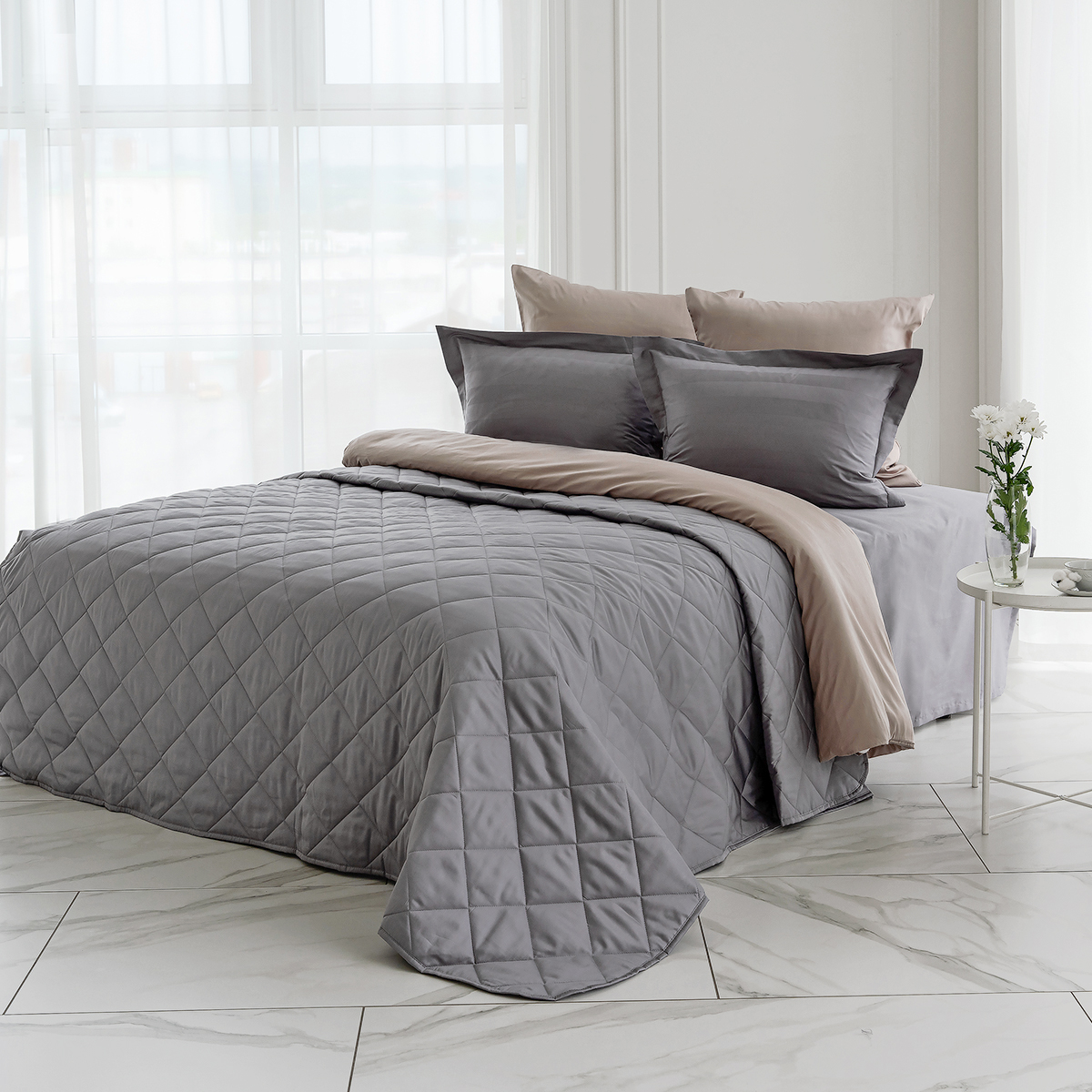 ОСОБЕННОСТЬ модели: хлопковое покрывало на кровать с закругленным уголком, практичной окантовкой по периметру изделия и стильной стежкой в виде ромбов. Верхняя и нижняя часть покрывала выполнены из высококачественного египетского хлопка – безопасного, натурального и комфортного материала.