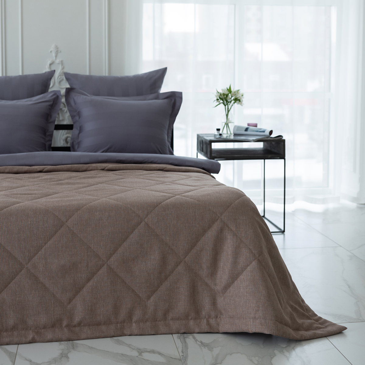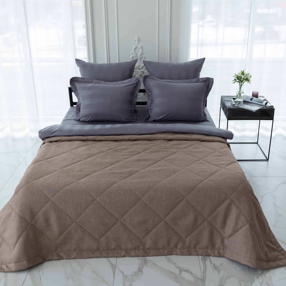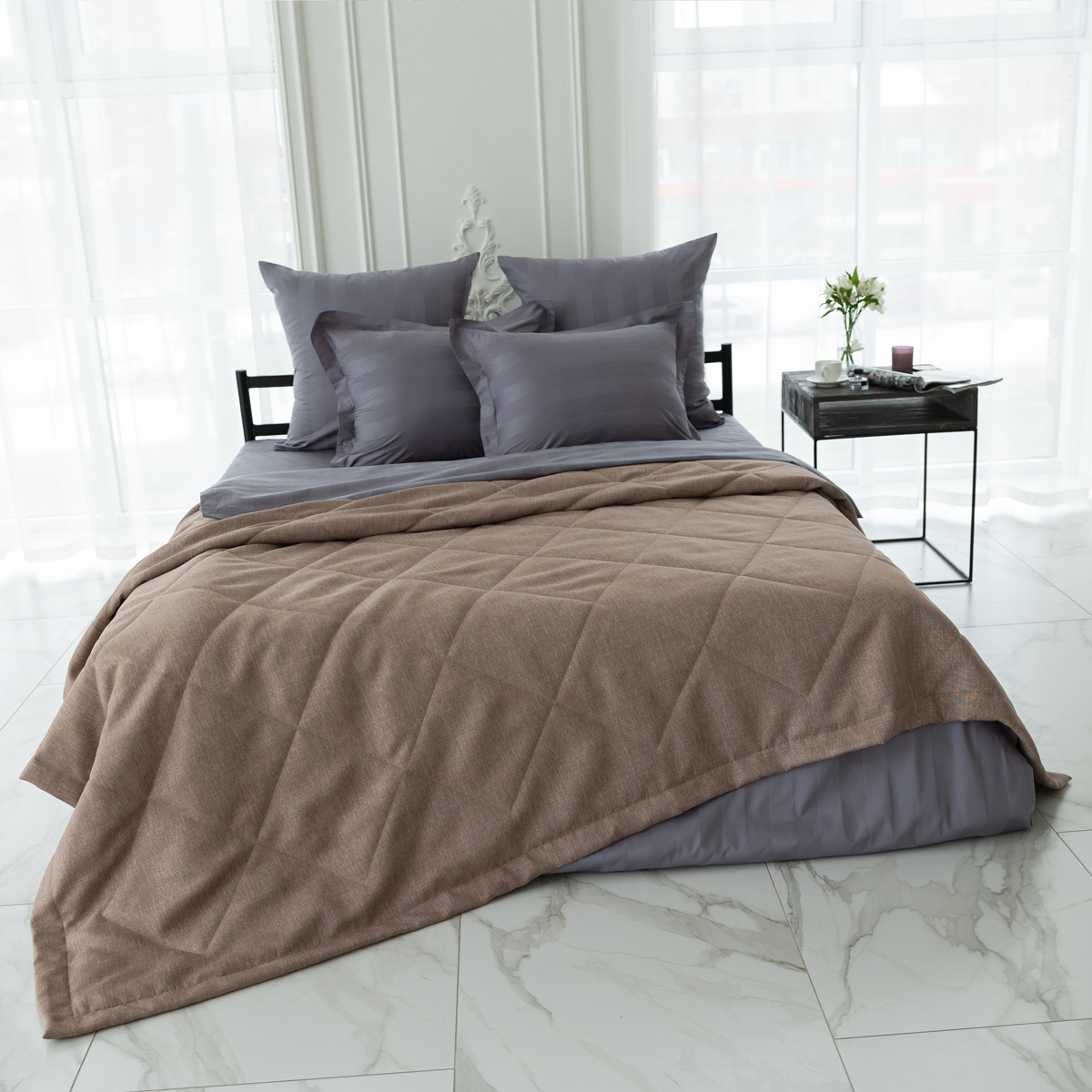 За покрывалом очень легко ухаживать, его можно стирать в домашних условиях при температуре 30С. Покрывало на кровать отлично держит форму и не дает усадку.