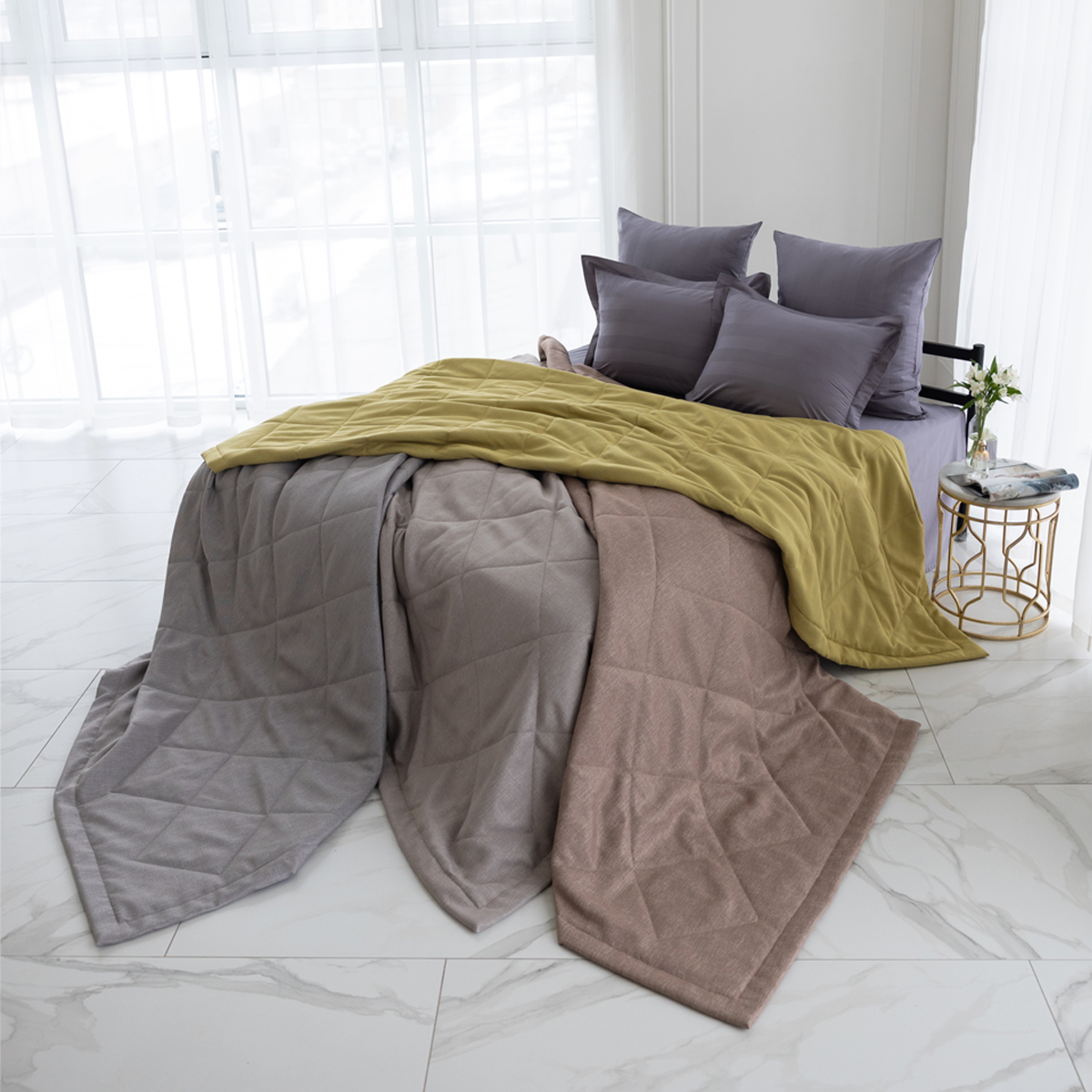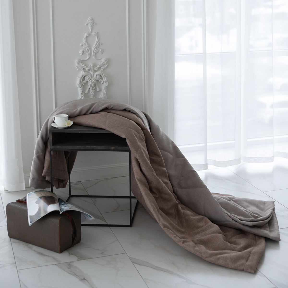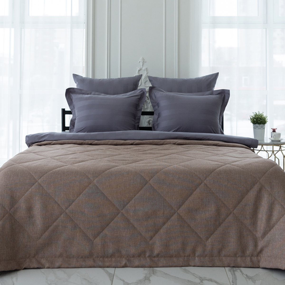 За покрывалом очень легко ухаживать, его можно стирать в домашних условиях при температуре 30С. Покрывало на кровать отлично держит форму и не дает усадку.