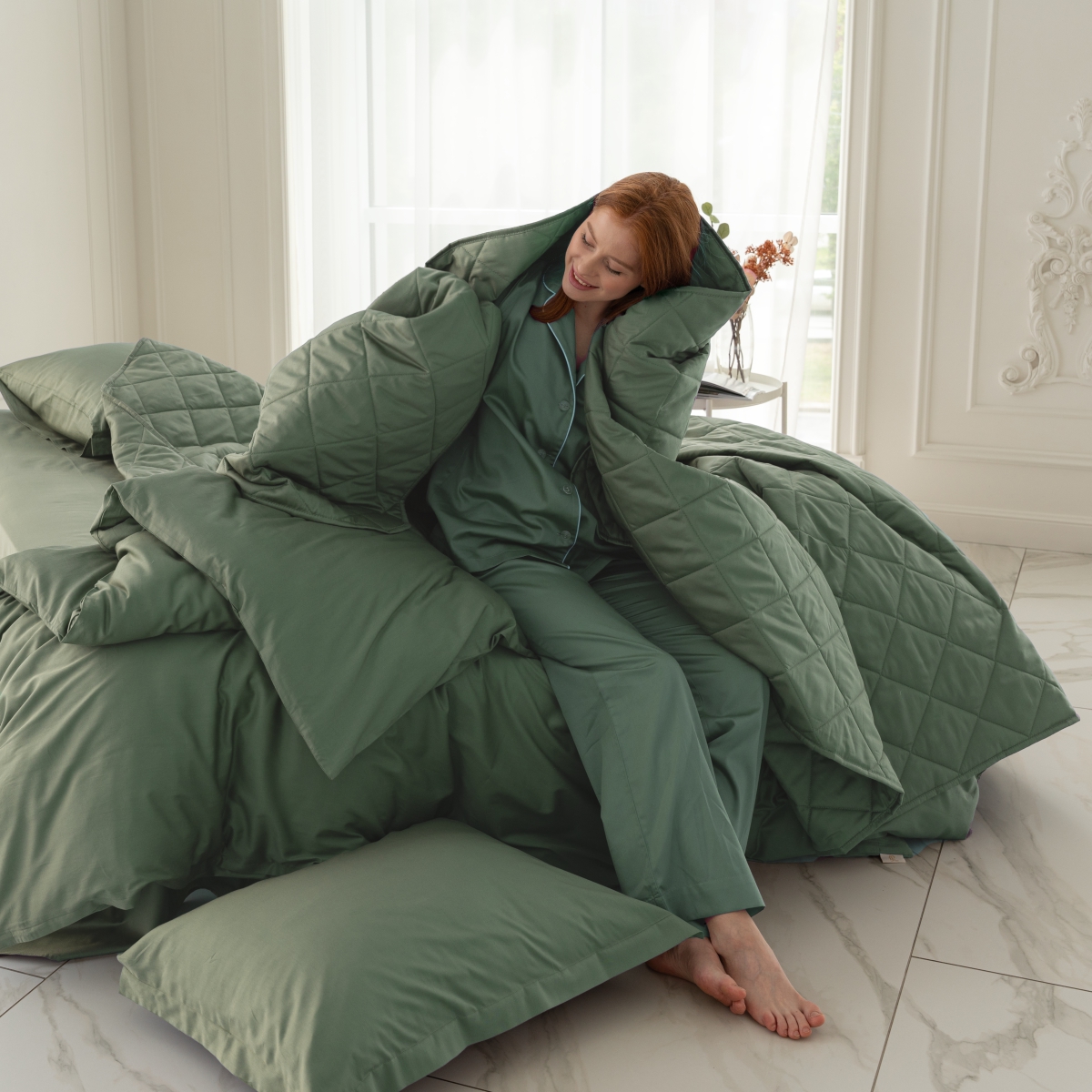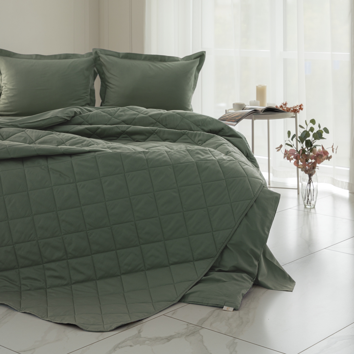За покрывалом очень легко ухаживать, его можно стирать в стиральной машине. Покрывало стеганное практично: на хлопковой ткани не остается зацепок.