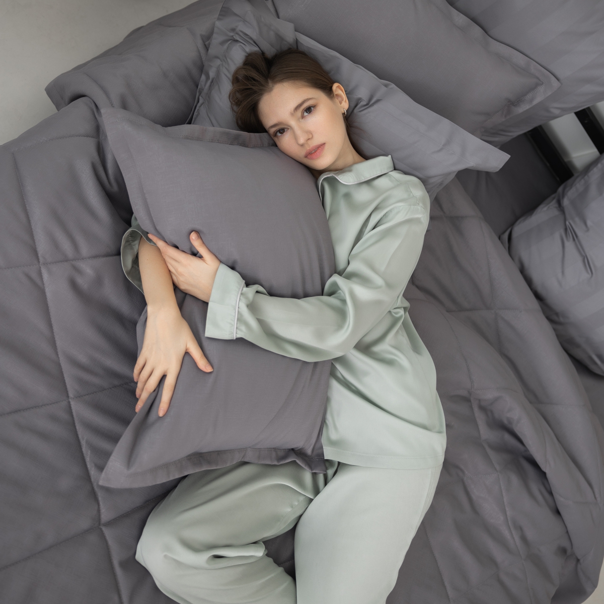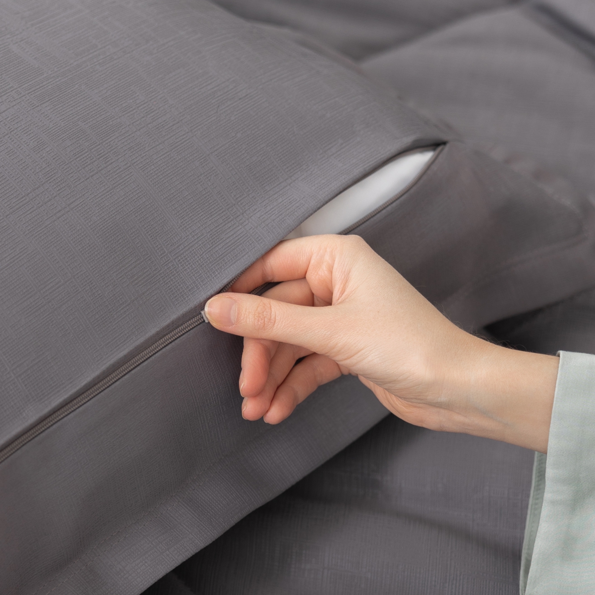 В комплект входит: покрывало стеганое 240х260см и декоративные наволочки с ушками, на молнии 50х70см.