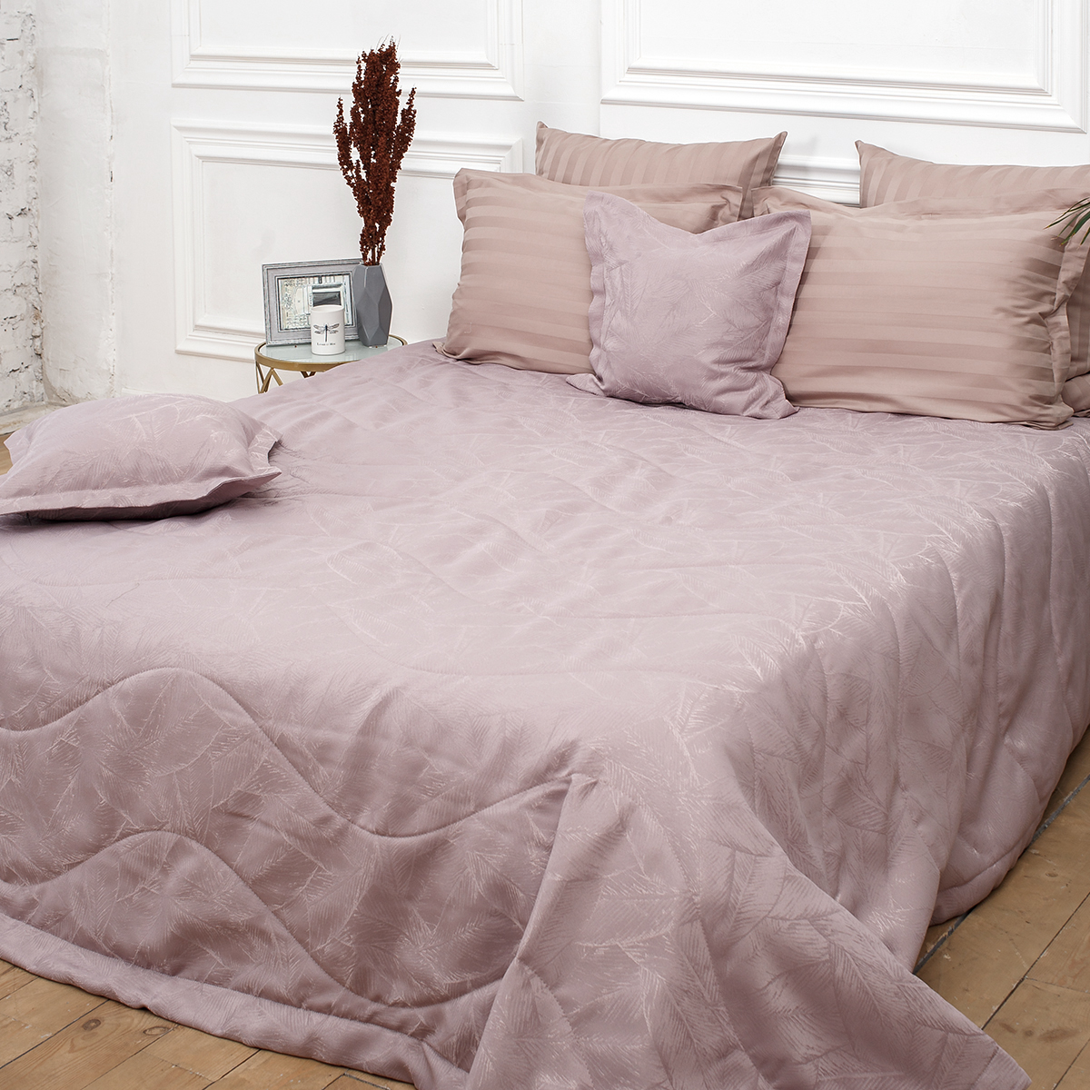 В комплект входит: стеганное покрывало на подкладе размер 240*260 см и 2 декоративные наволочки 45х45 см на молнии. Наволочки с четырех сторон декорированы ушками шириной 4 см.