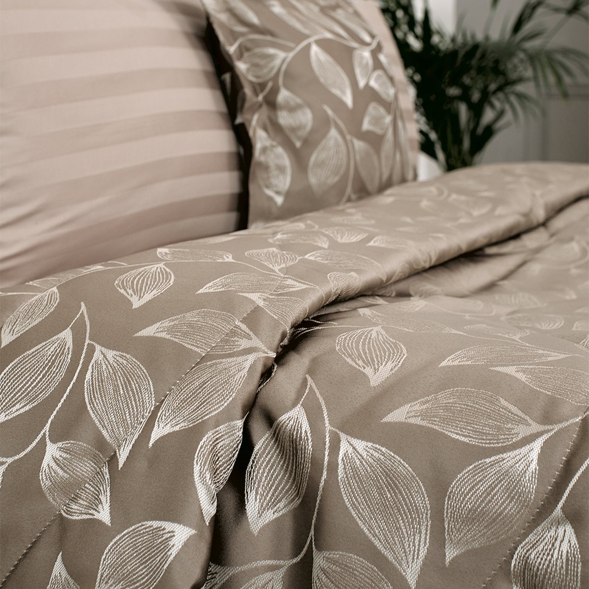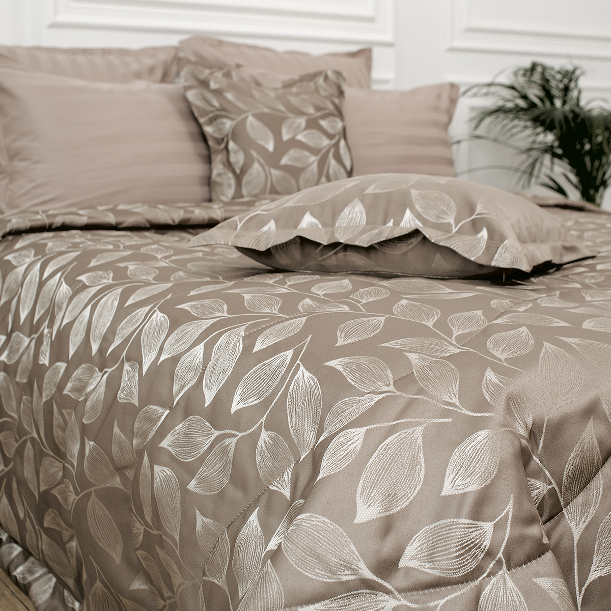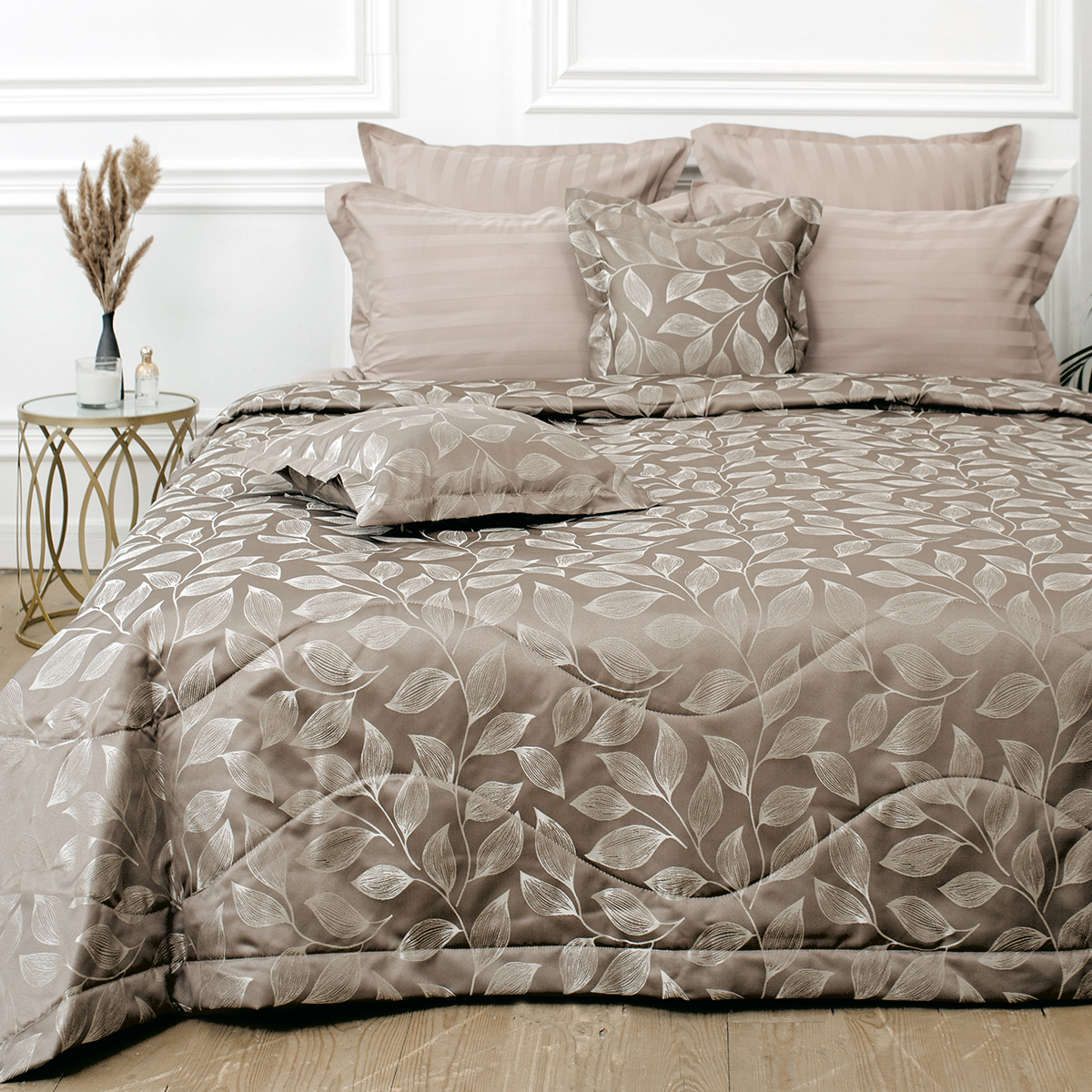 В комплект входит: стеганное покрывало на подкладе размер 240*260 см и 2 декоративные наволочки 45х45 см на молнии. Наволочки с четырех сторон декорированы ушками шириной 3 см.