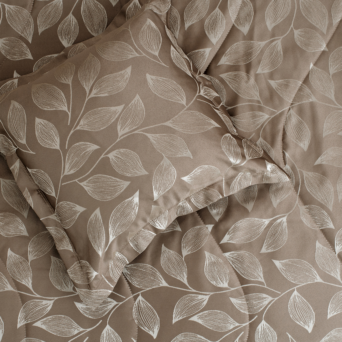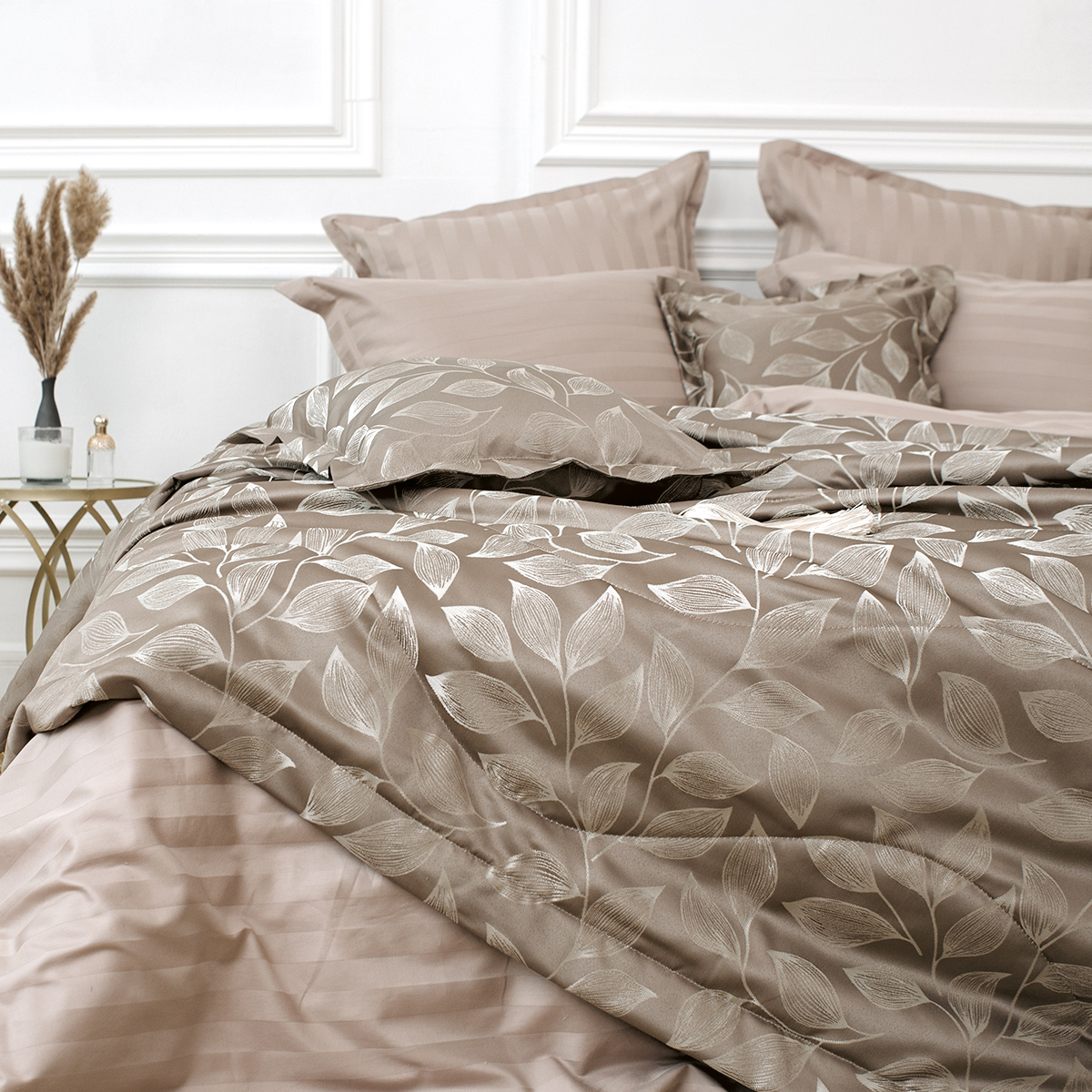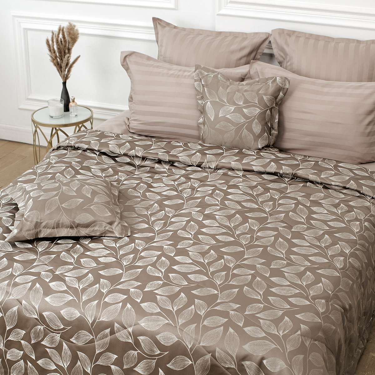 В комплект входит: стеганное покрывало на подкладе размер 240*260 см и 2 декоративные наволочки 45х45 см на молнии. Наволочки с четырех сторон декорированы ушками шириной 3 см.