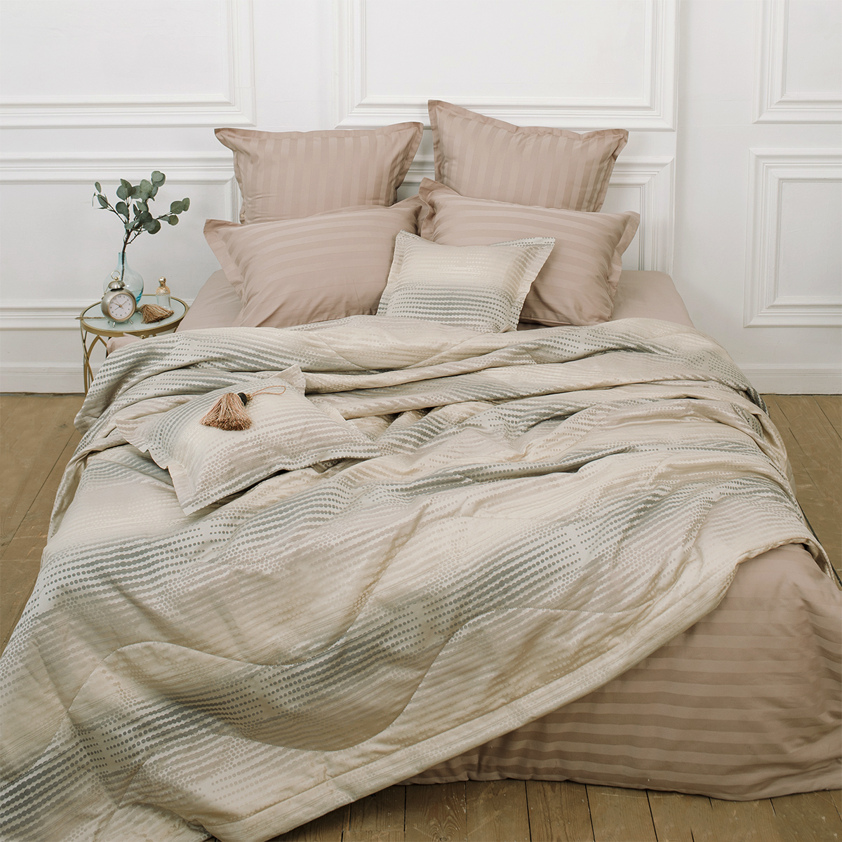 В комплект входит: стеганное покрывало на подкладе размер 240*260 см и 2 декоративные наволочки 45х45 см на молнии. Наволочки с четырех сторон декорированы ушками шириной 3 см.