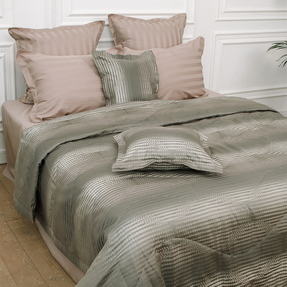 В комплект входит: стеганное покрывало на подкладе размер 240*260 см и 2 декоративные наволочки 45х45 см на молнии. Наволочки с четырех сторон декорированы ушками шириной 3 см.