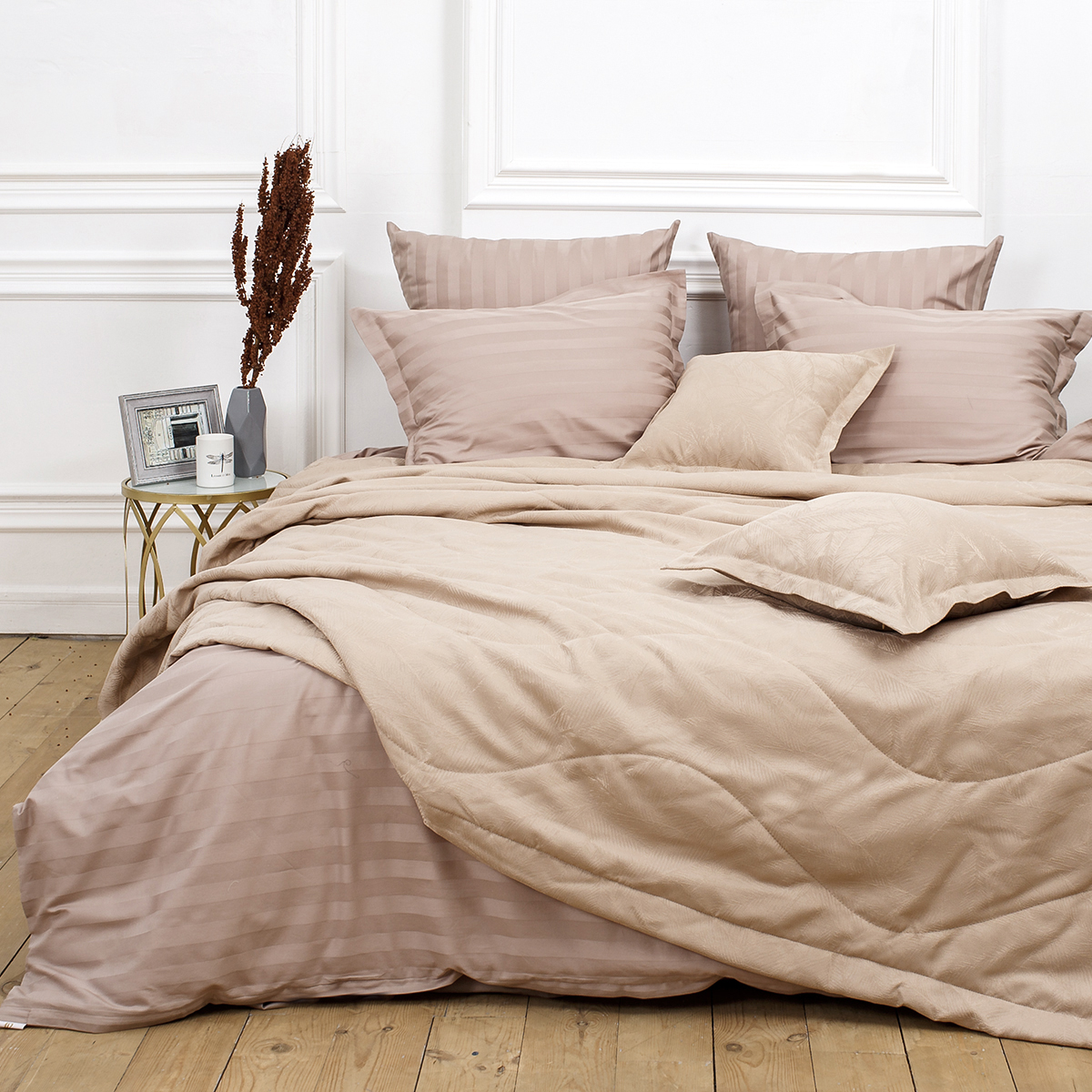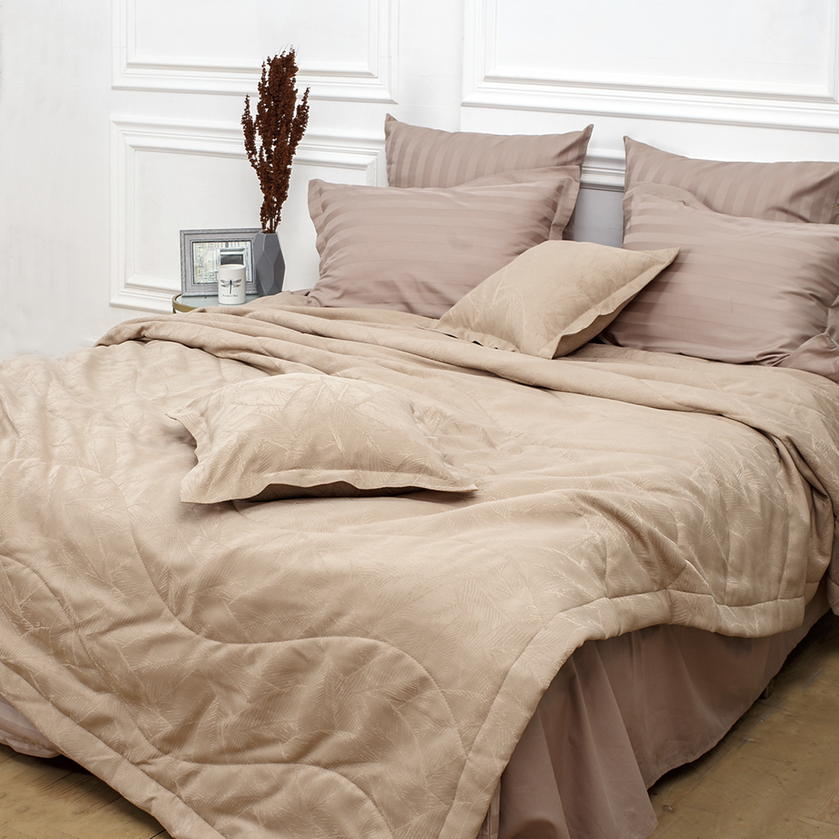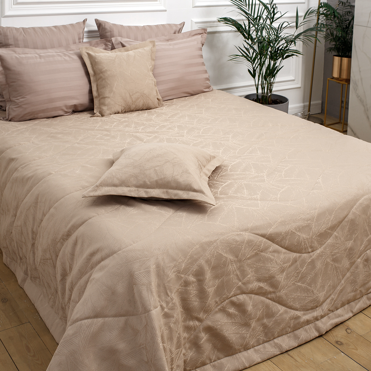В комплект входит: стеганное покрывало на подкладе размер 240*260 см и 2 декоративные наволочки 45х45 см на молнии. Наволочки с четырех сторон декорированы ушками шириной 4 см.