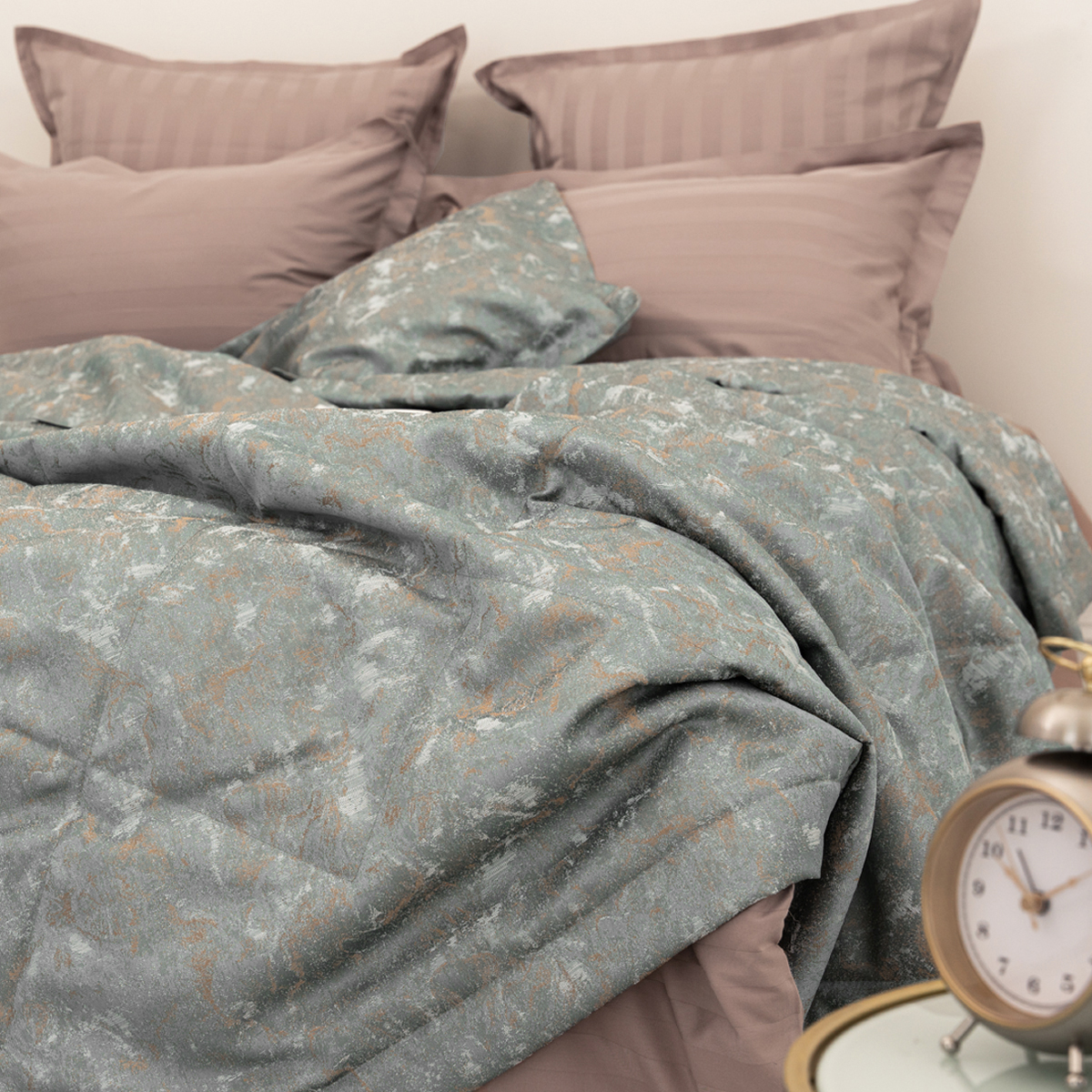 Покрывало Glori - современный стильный дизайн, с ноткой индивидуальности и завораживающей глубины. Она придаст пространству спальни особый шарм. Смотрится изысканно и элегантно, сочетает в себе изящный жаккардовый блеск, благородные цвета и фактуру.