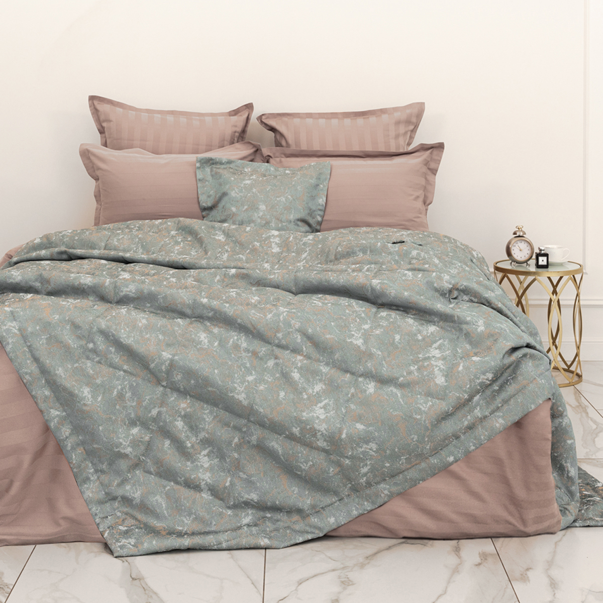 Состав: ткань портьерная жаккард 100% пэ, наполнитель - полиэфирное волокно. Стежка в виде ромбов. Подклад покрывала – микрофибра велюр, за счет своей фактуры он предотвращает скольжение покрывала на кровати.