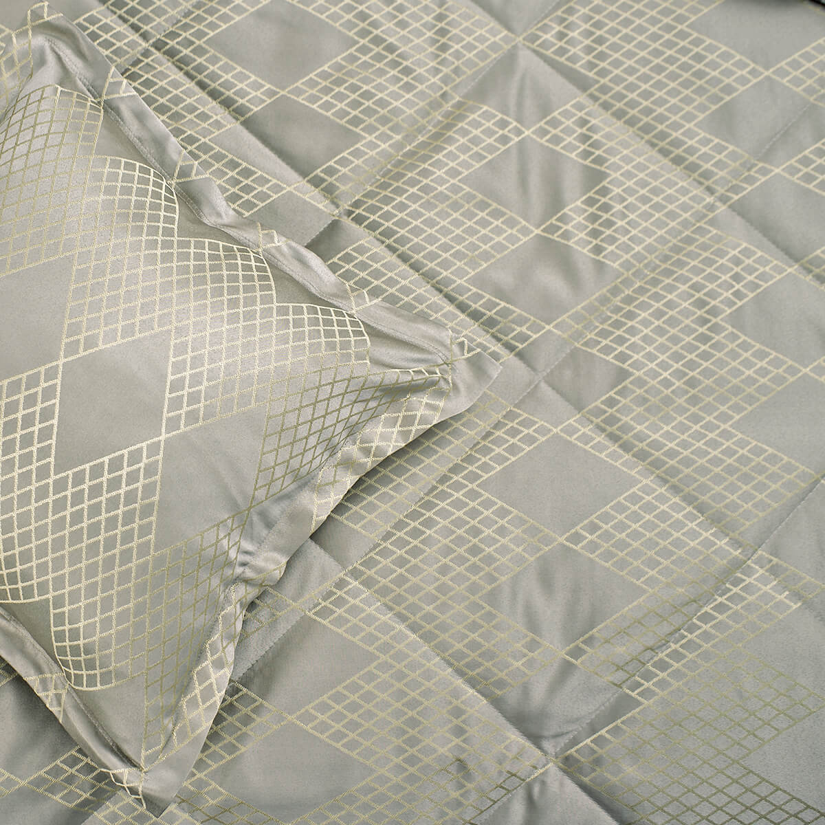 В комплект входит: стеганное покрывало на подкладе размер 240*260 см и 2 декоративные наволочки 45х45 см на молнии. Наволочки с четырех сторон декорированы ушками шириной 4 см.