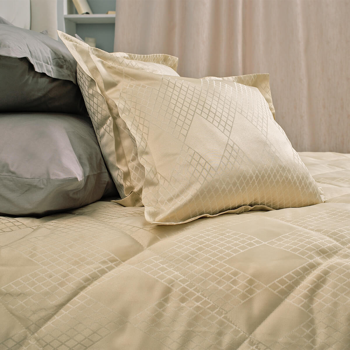 В комплект входит: стеганное покрывало на подкладе размер 240*260 см и 2 декоративные наволочки 45х45 см на молнии. Наволочки с четырех сторон декорированы ушками шириной 4 см.