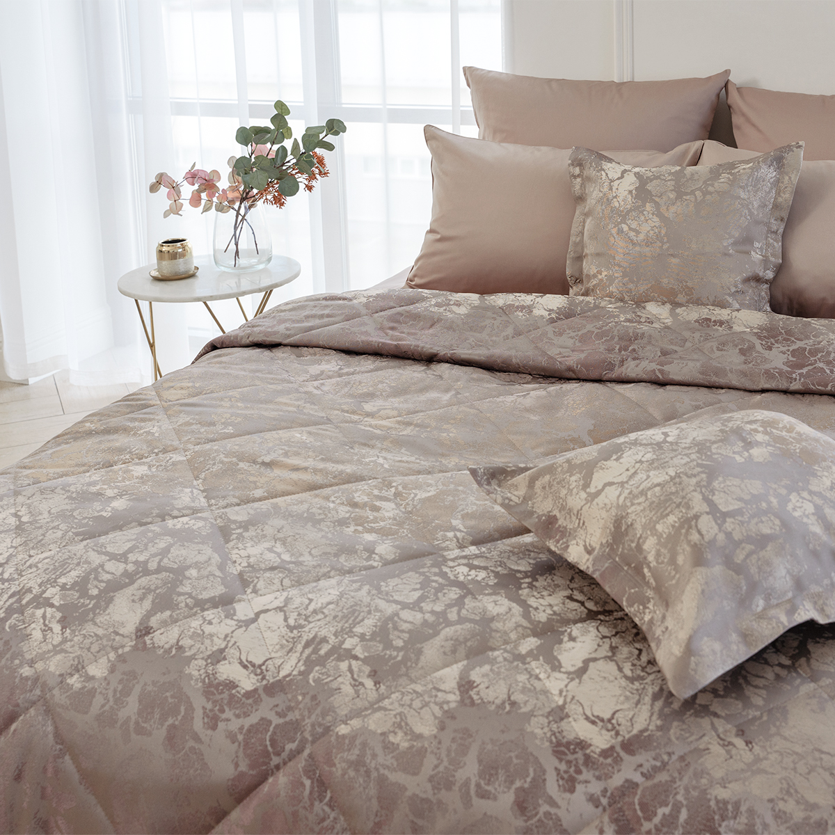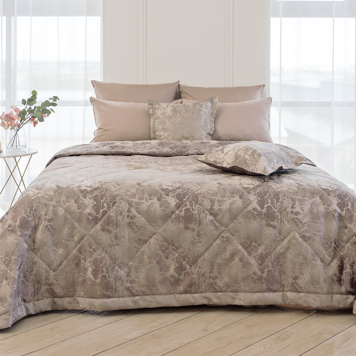 Состав: ткань портьерная 100% пэ, наполнитель - полиэфирное волокно. Стежка в виде ромбов. Подклад покрывала – микрофибра велюр, за счет своей фактуры он предотвращает скольжение покрывала на кровати.