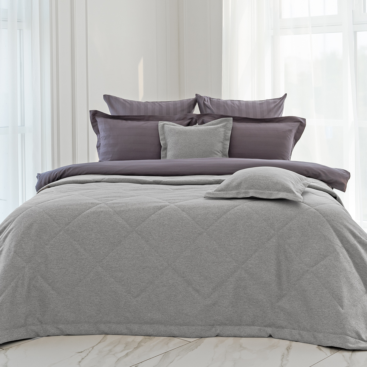 Состав: ткань портьерная 100% пэ - димаут, наполнитель - полиэфирное волокно. Стежка в виде ромбов. Подклад покрывала – микрофибра велюр, за счет своей фактуры он предотвращает скольжение покрывала на кровати.