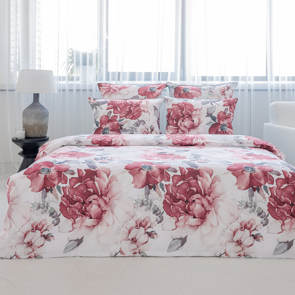 Эффектный акварельный принт, созданных искусным художником. Яркая и сочная красота крупных бутонов чарует и манит… Изящество и нежную красоту роскошного дизайна подчеркивает нежный белоснежный фон комплекта.