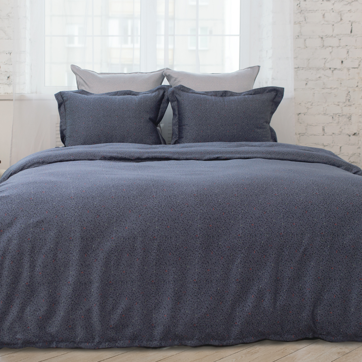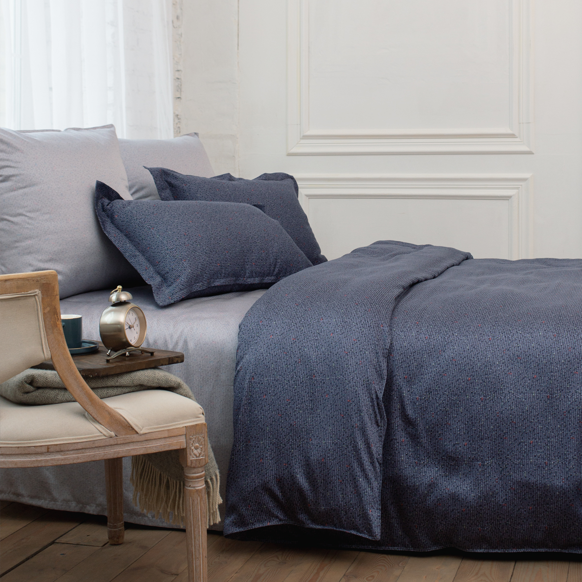 Неповторимая глубина благородного синего оттенка в сочетании с универсальным серым - строгая и ультрамодная контрастность выгодно подчеркнет индивидуальность и украсит интерьер спальни.