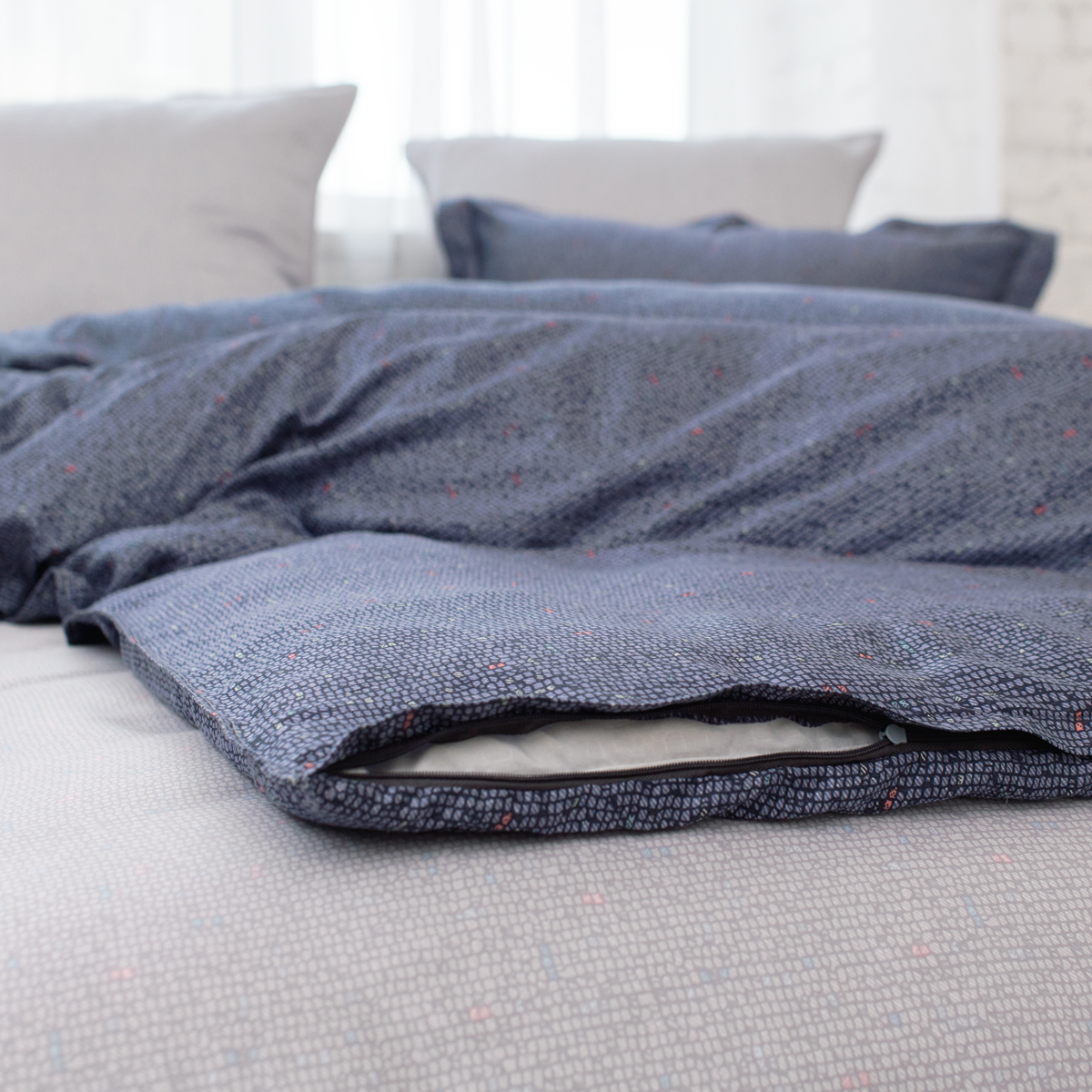 - «Невидимая» молния во всю ширину по нижнему краю пододеяльника. Двойная отделочная отсрочка по 3м сторонам пододеяльника