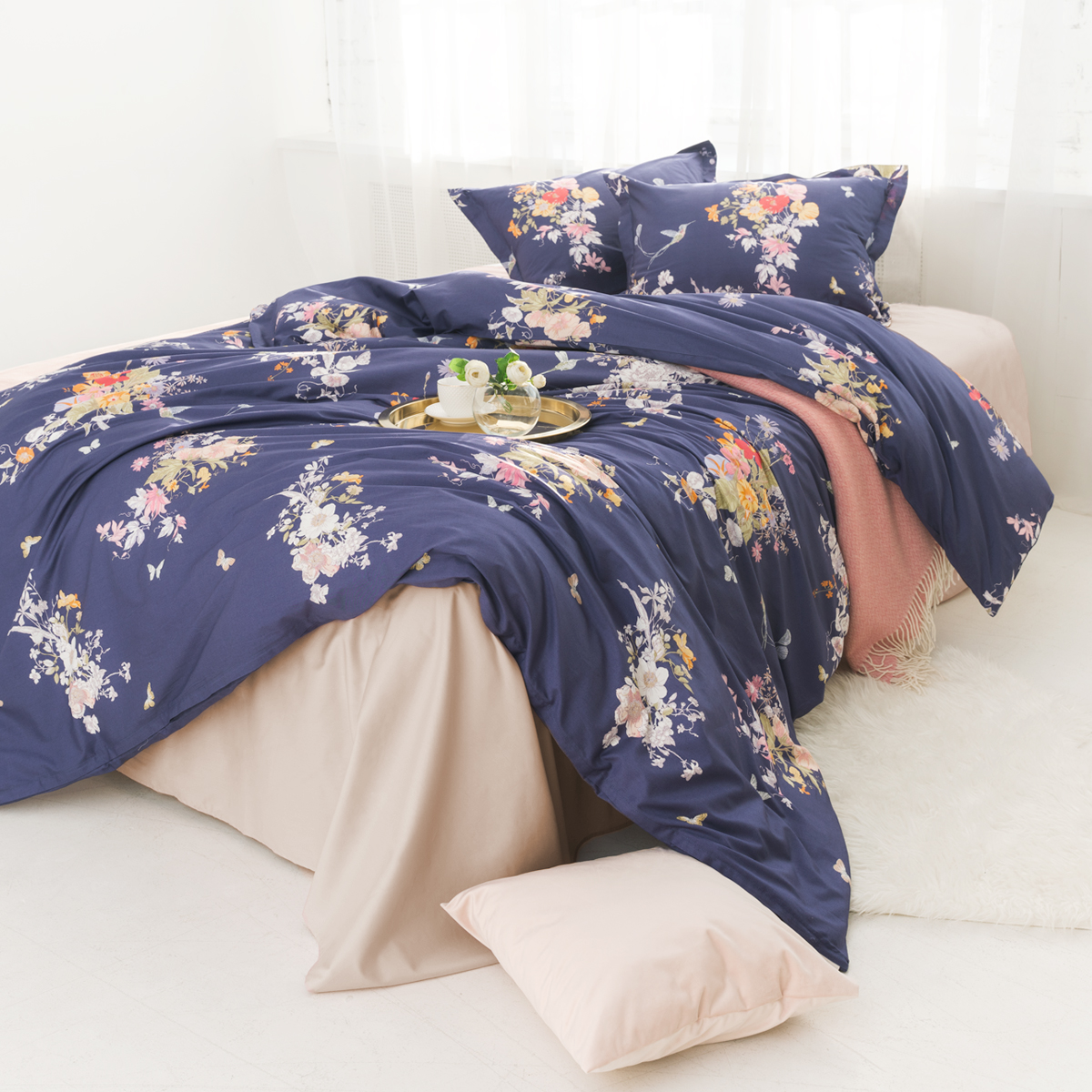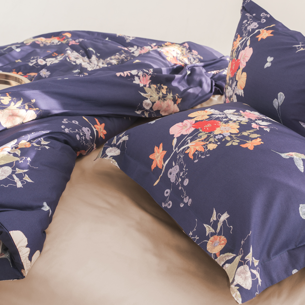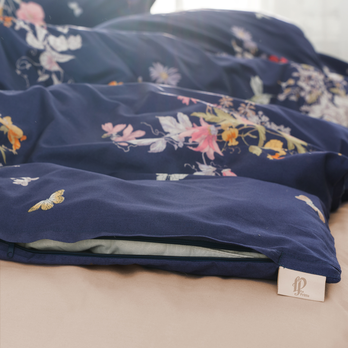 Нежный цветочный принт на интригующем синем фоне привносит невероятную фантазийность в дизайн постельного белья. Единство противоположностей и гармония цветовых сочетаний, нега и чувственность. Эксклюзивные печатные принты созданы в собственной дизайн студии La Prima.