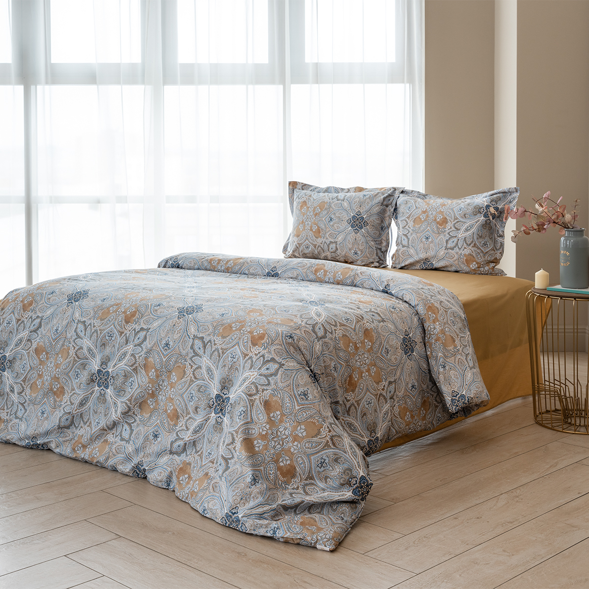 Завораживающий и манящий восточный орнамент, он всегда актуален. Дизайн стильно подчеркнут универсальной и гармоничной палитрой песочных и серо-голубых оттенков. Эксклюзивные печатные принты созданы в собственной дизайн студии La Prima.