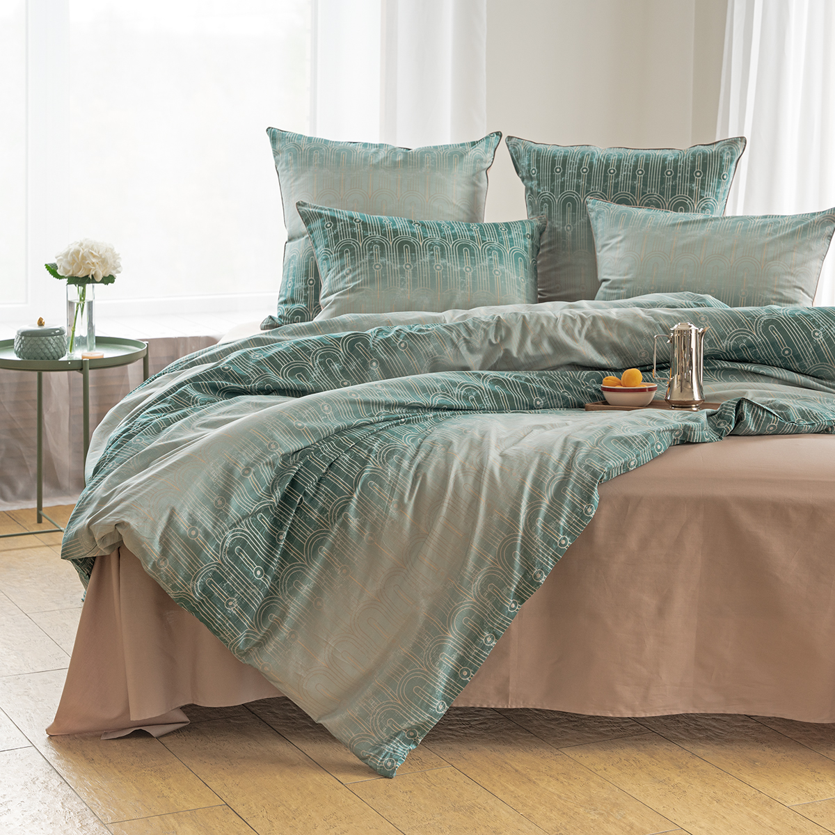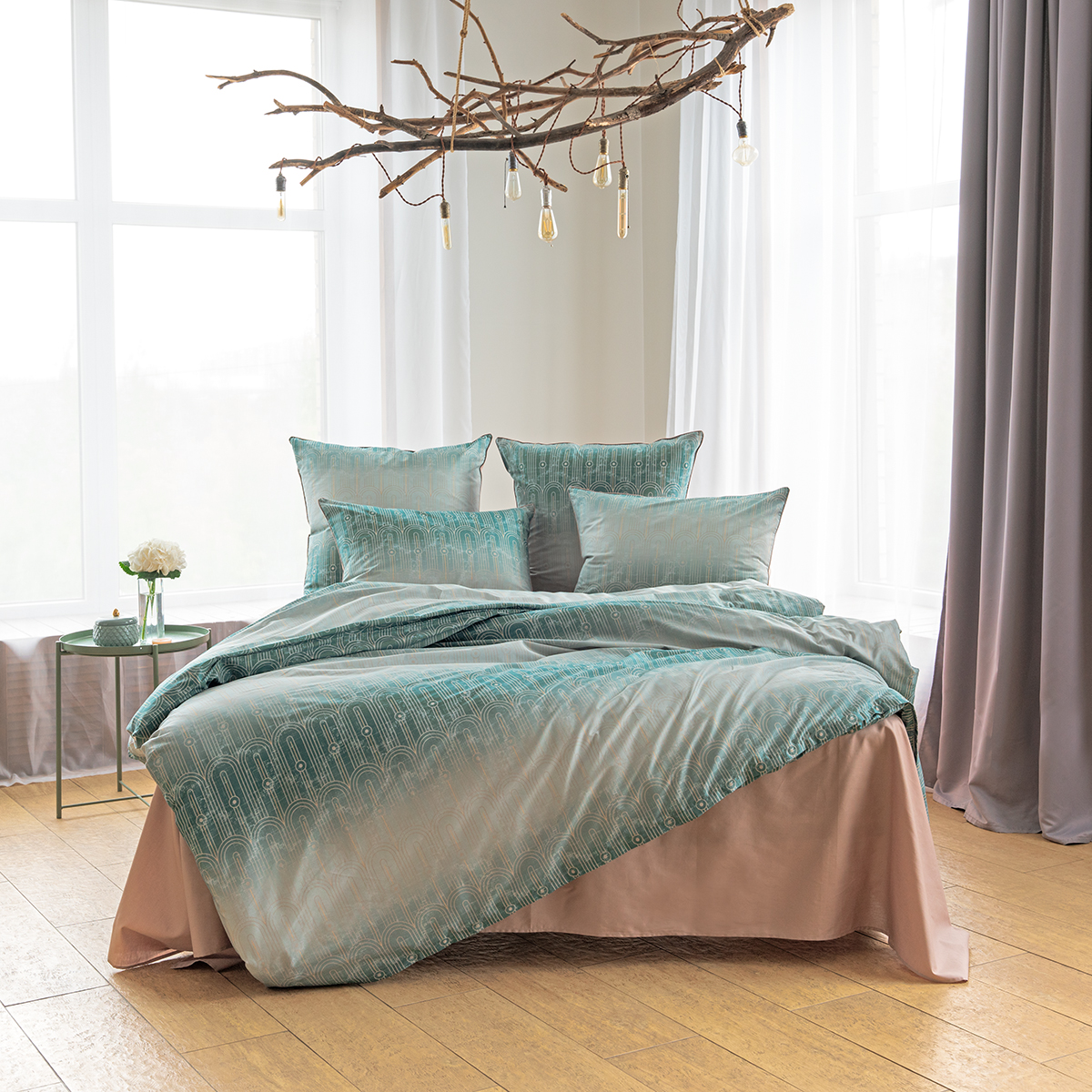 Постельное белье «Массимо» - чарующий градиент от глубокого нефритового оттенка до мягкого бежевого. Изящные линии орнамента напоминают стилизованную решетку итальянских палаццо.
