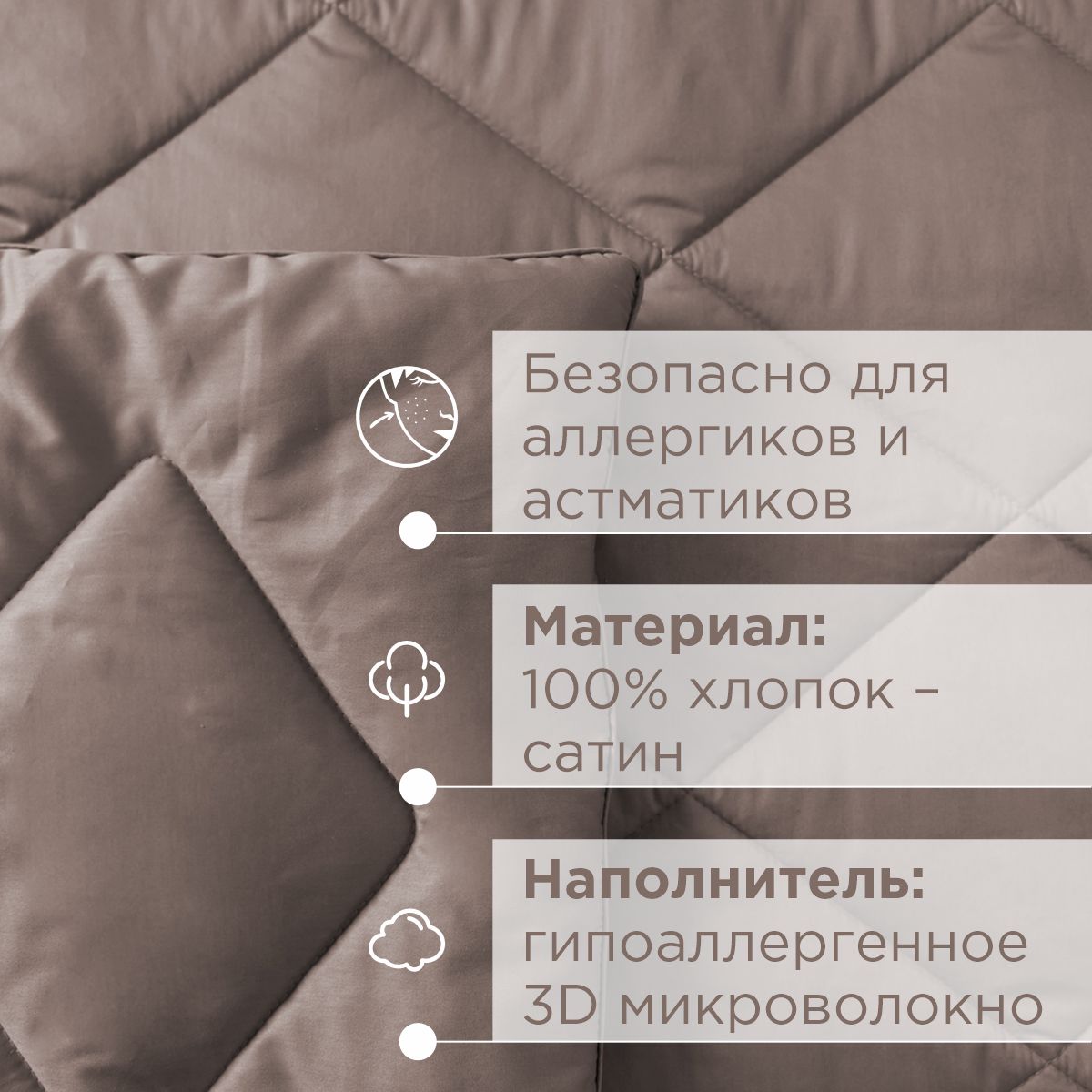 - Стеганое одеяло 140х205см. Одеяло всесезонное, плотность 200гр, что позволяет пользоваться им круглый год. Наполнитель у одеяла: гипоаллергенное 3D микроволокно, не сбивается после стирок.