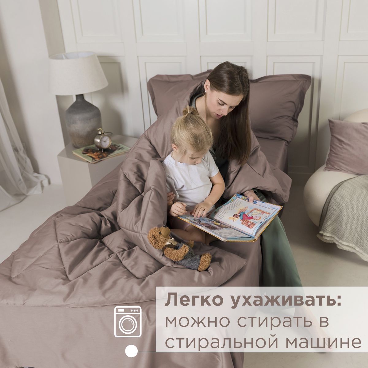 За постельным бельем с одеялом легко ухаживать, его можно стирать в стиральной машине, оно выдерживает до 500 стирок.