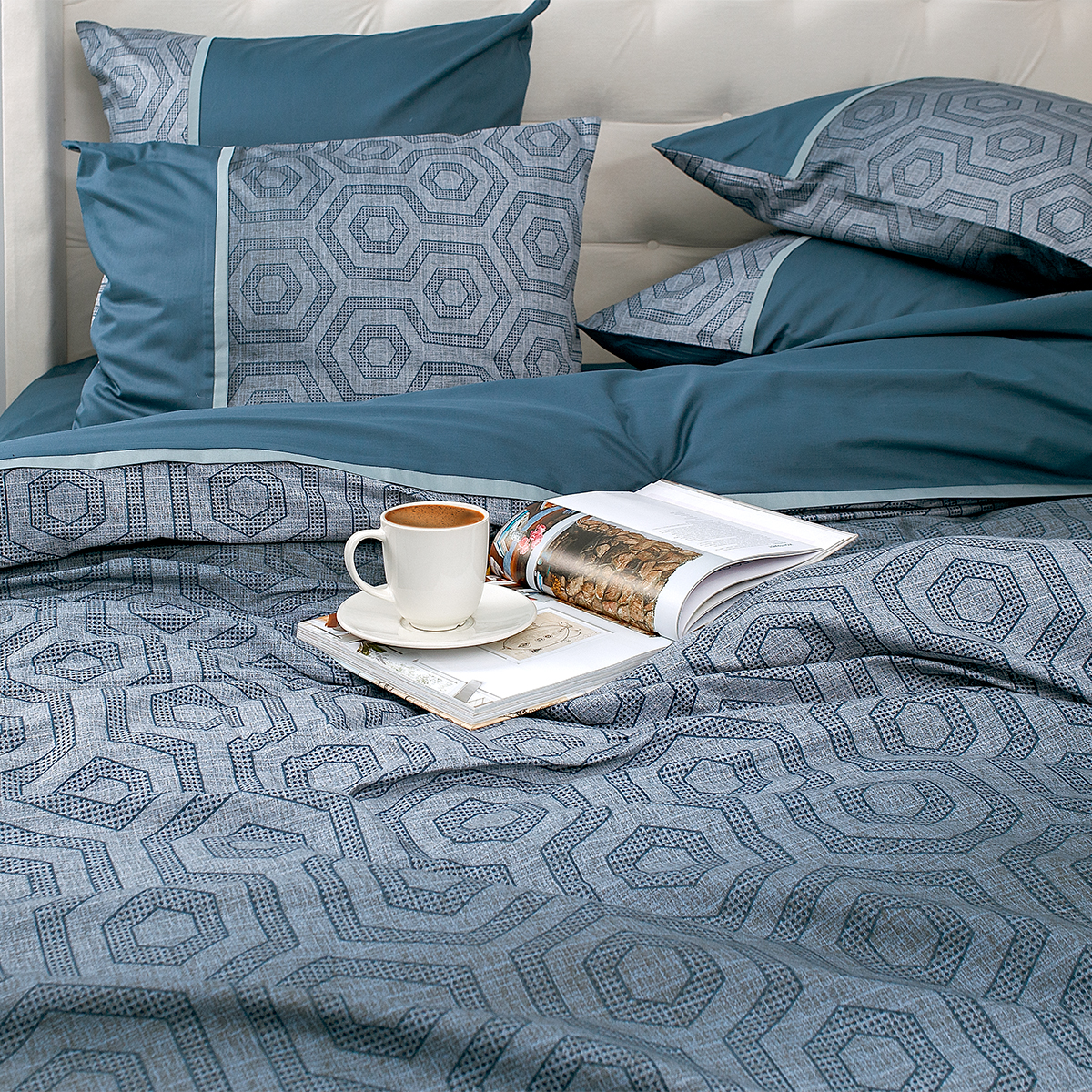 Смелый и дерзкий... Ультрамодная игра сочетаний: стильный геометрический орнамент, замысловатая архитектура ломанных линий и форм удачно подчеркивает стиль и лаконичность современного интерьера. Особую брутальность комплекту придают глубокие и насыщенные лазурно-изумрудные оттенки.