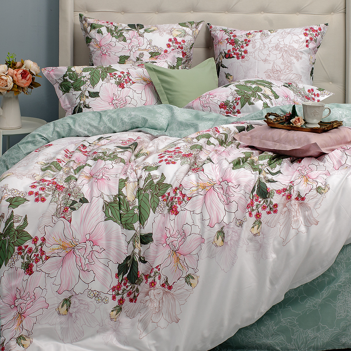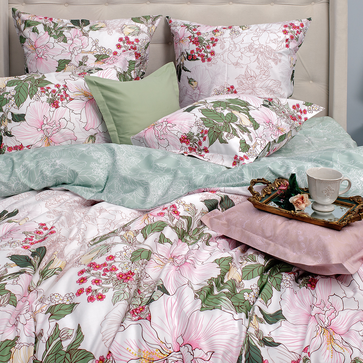 Цветущий сад, будто окутанный волшебным флером изящных цветочных композиций. Дополнен зеленым оттенком шалфея, который вносит модную и очаровательную нотку свежести в интерьер спальни.
