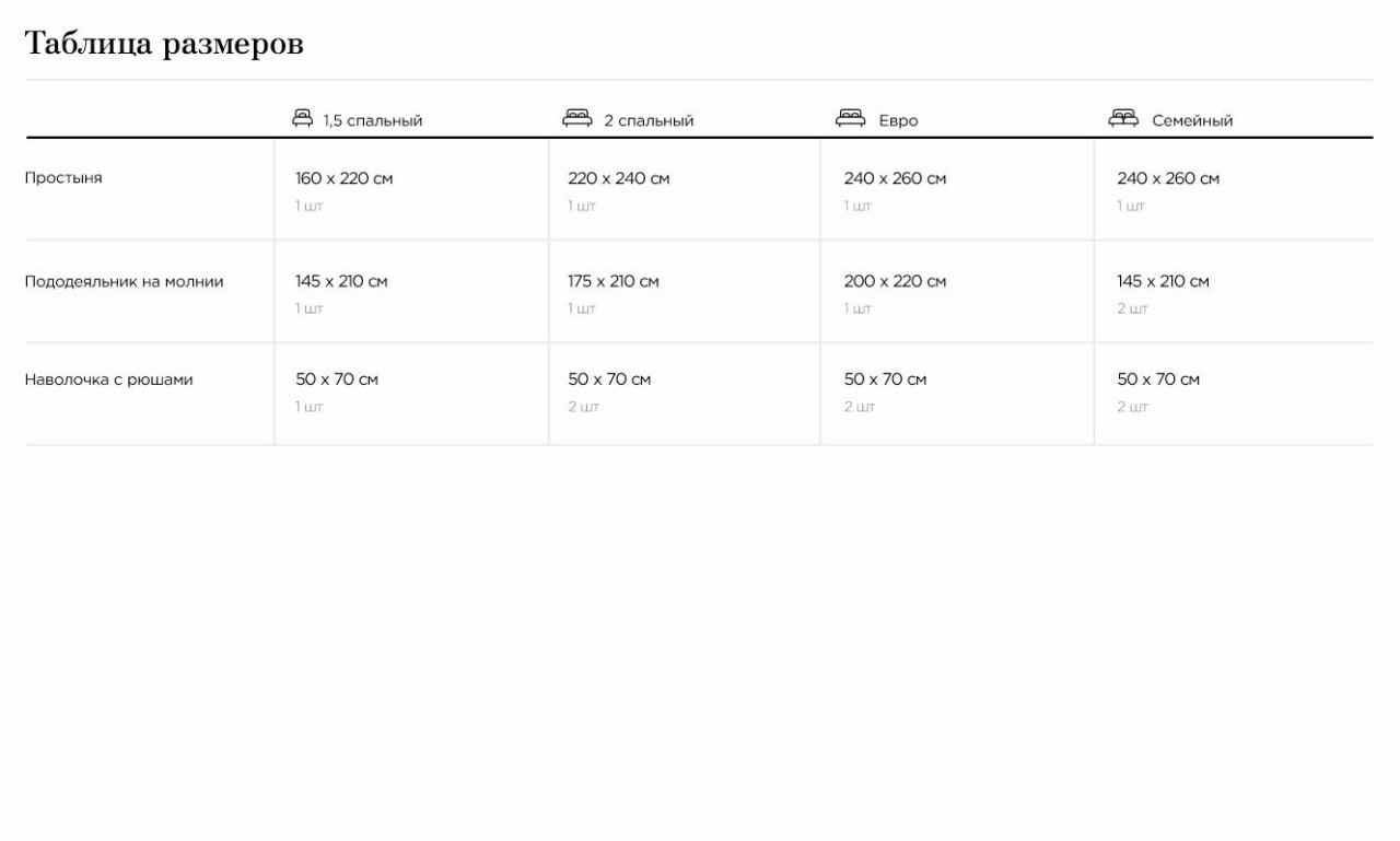 - Простыня 240х260 см в размерах постельного белья Евро и Семейном.