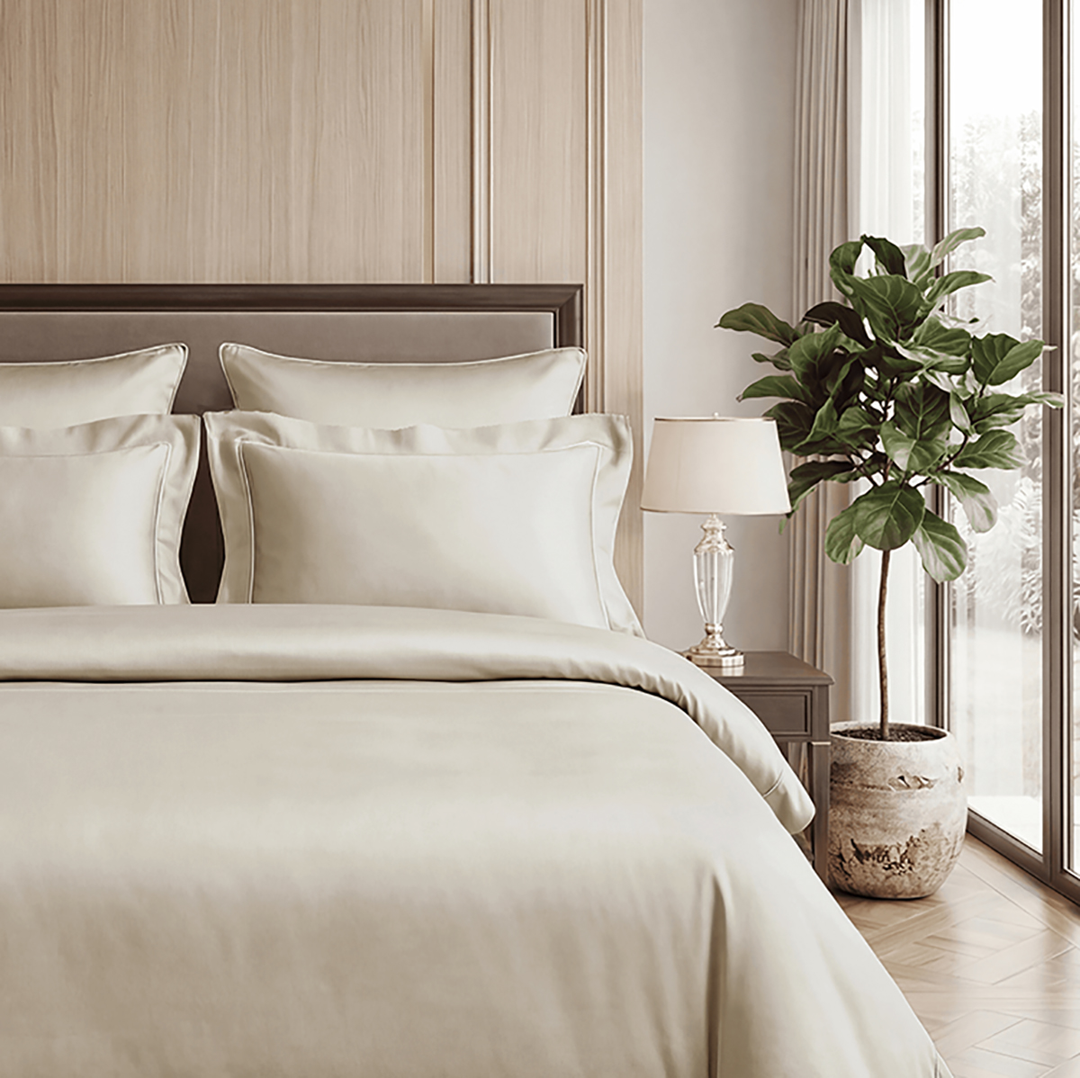 Редкий длинноволокнистый хлопок: нити прочнее и тоньше обычного, поэтому ткань не пиллингуется и не теряет форму. Сатиновое плетение создаёт живое сияние, как у шёлка, но с комфортом дышащего хлопка. Не электризуется, не скользит, приятен к телу. Выдерживает 500+ стирок без потери яркости и мягкости.