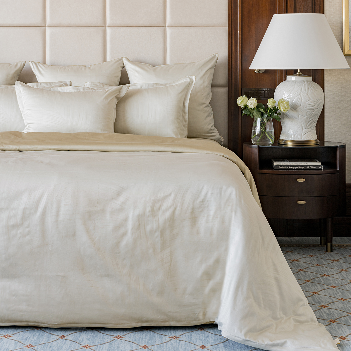 - Лицевая сторона наволочек и пододеяльника выполнена из жаккардовой ткани, оборотная из премиального длинноволокнистого хлопка сорта Пима
