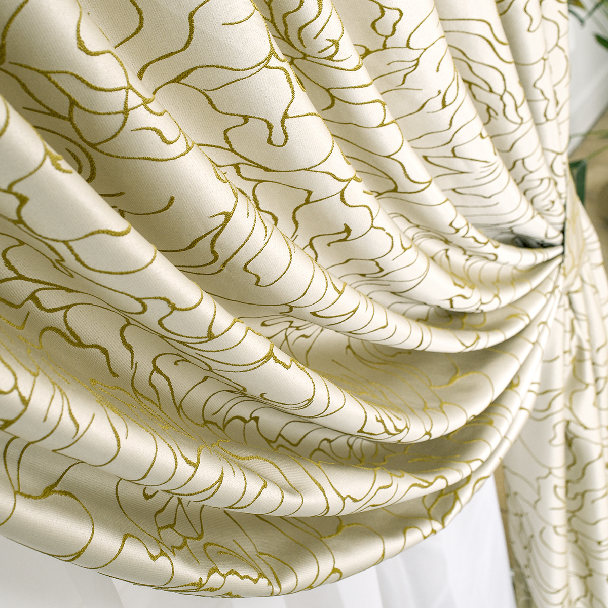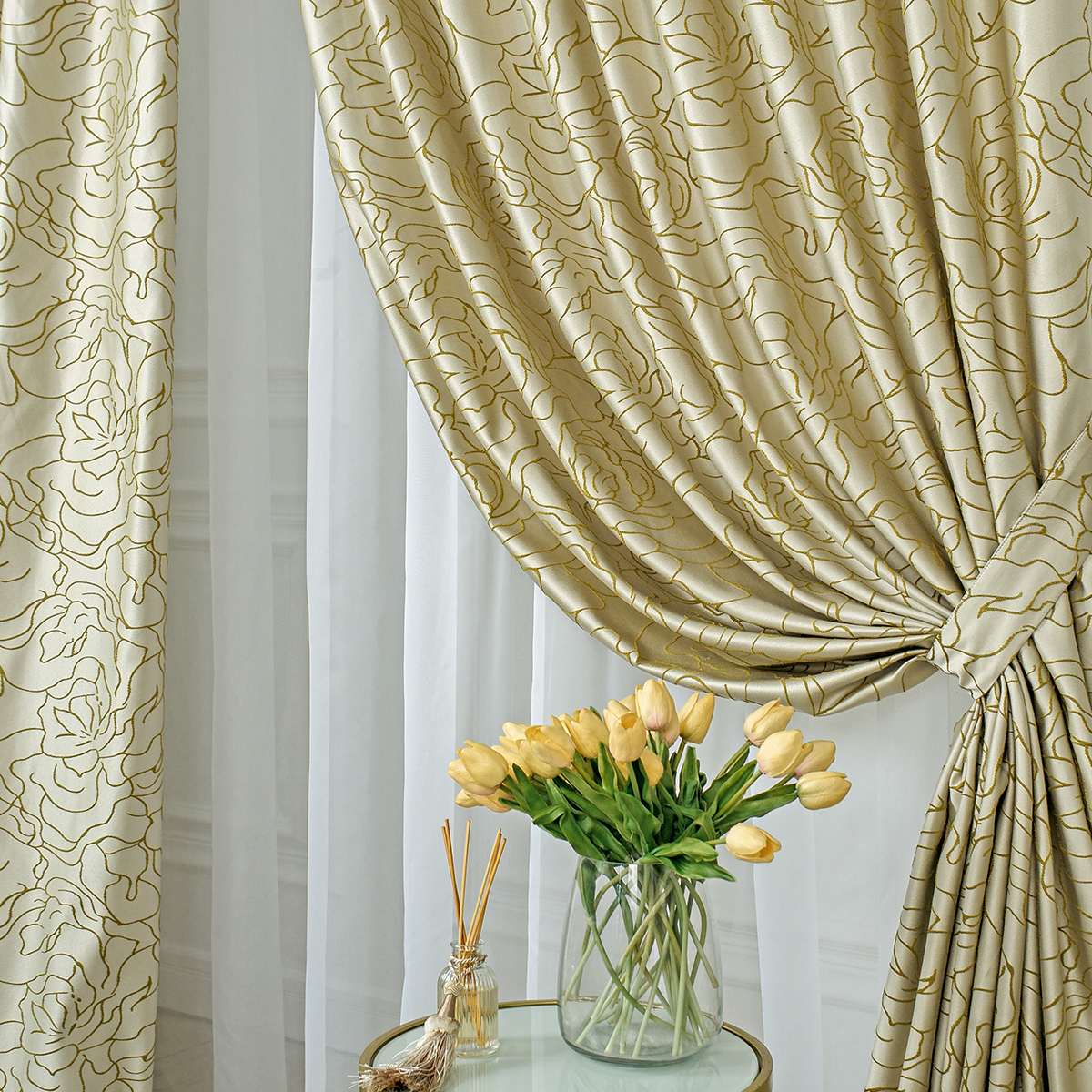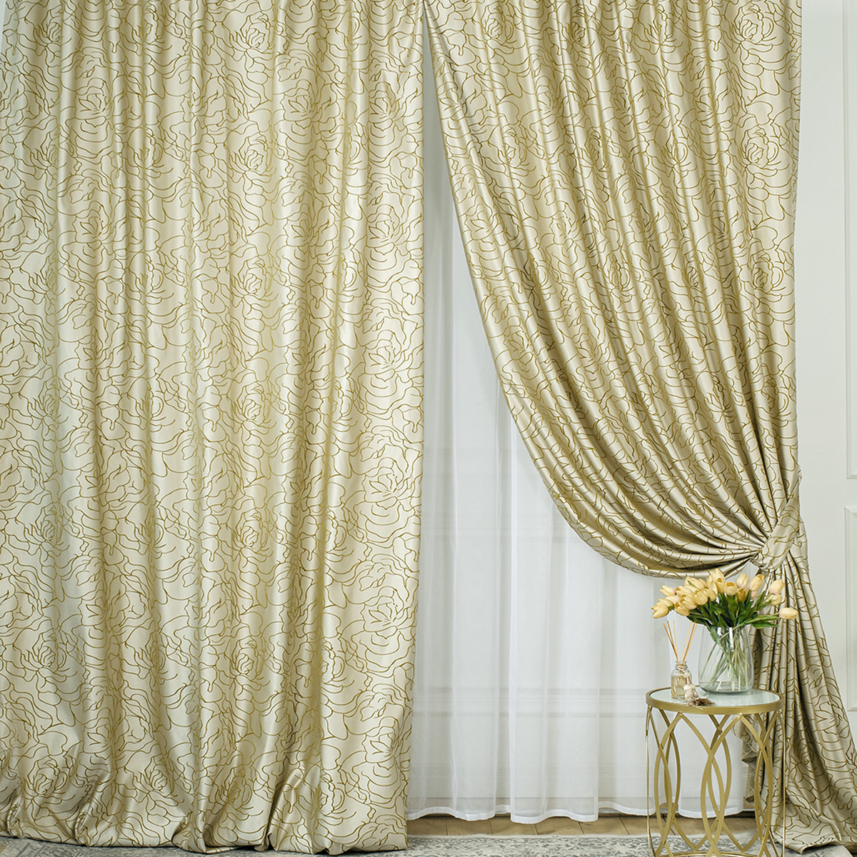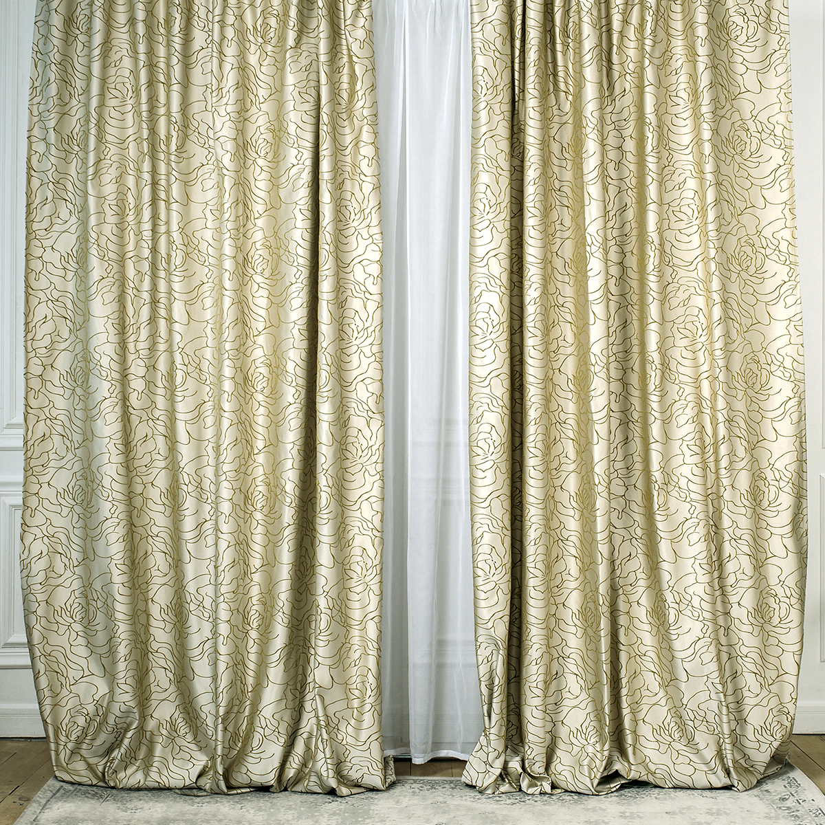 Готовые шторы отшиты на ленте – её можно стягивать и подстраивать под размер окна. Шторная лента, в свою очередь, является прекрасным помощником в создании объемной драпировки. Рекомендуемая длина карниза 250-300см. Низ штор обработан оверлоком для самостоятельного подгона изделия по высоте.